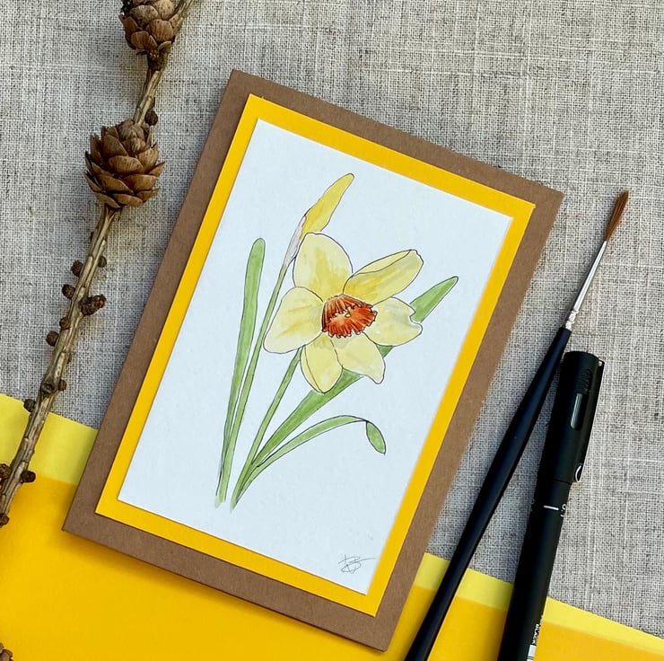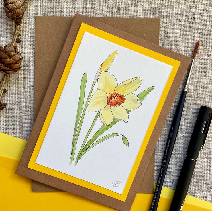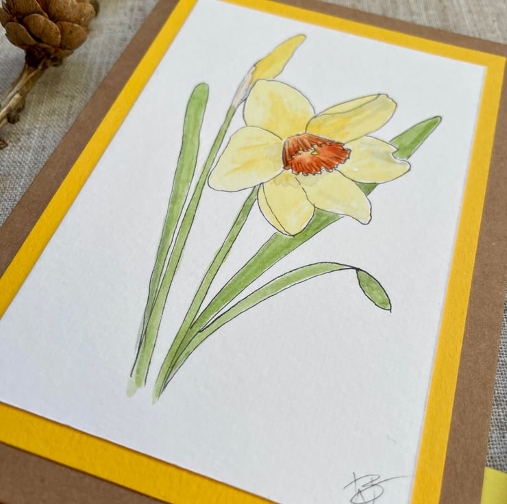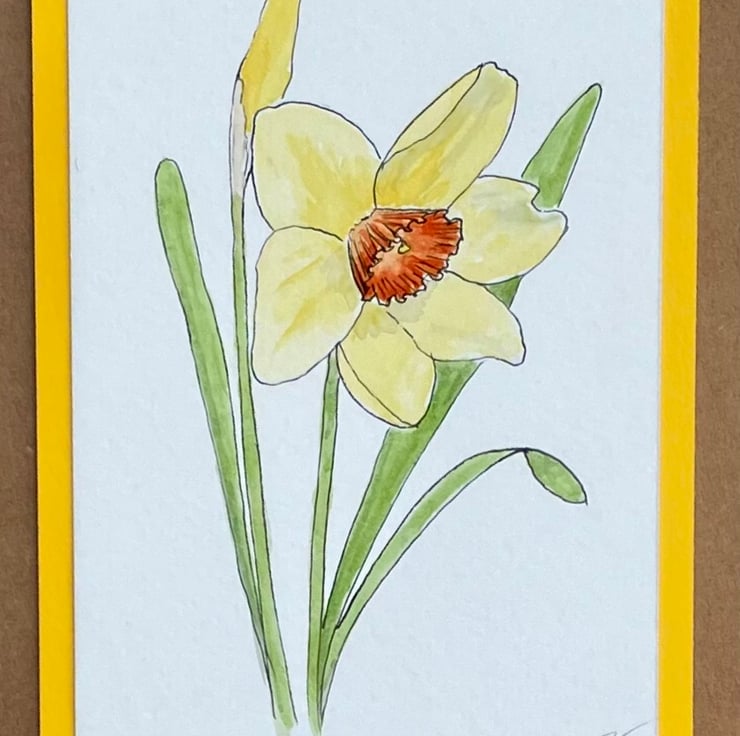 This blank greeting card features one fully open daffodil with yellow petals surrounding an orange trumpet and one daffodil bud, hand drawn in ink pen and watercolour and mounted onto a complementary yellow background border, it is left blank for any occasion and would make a lovely card for a spring birthday, Mother's Day, or just sending a pretty note to a friend but could also be framed and put up on a wall.