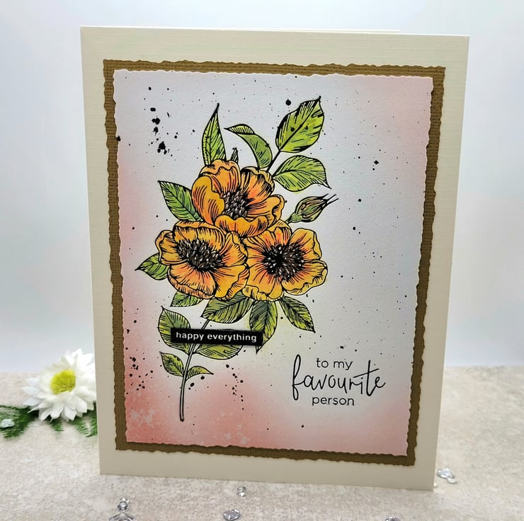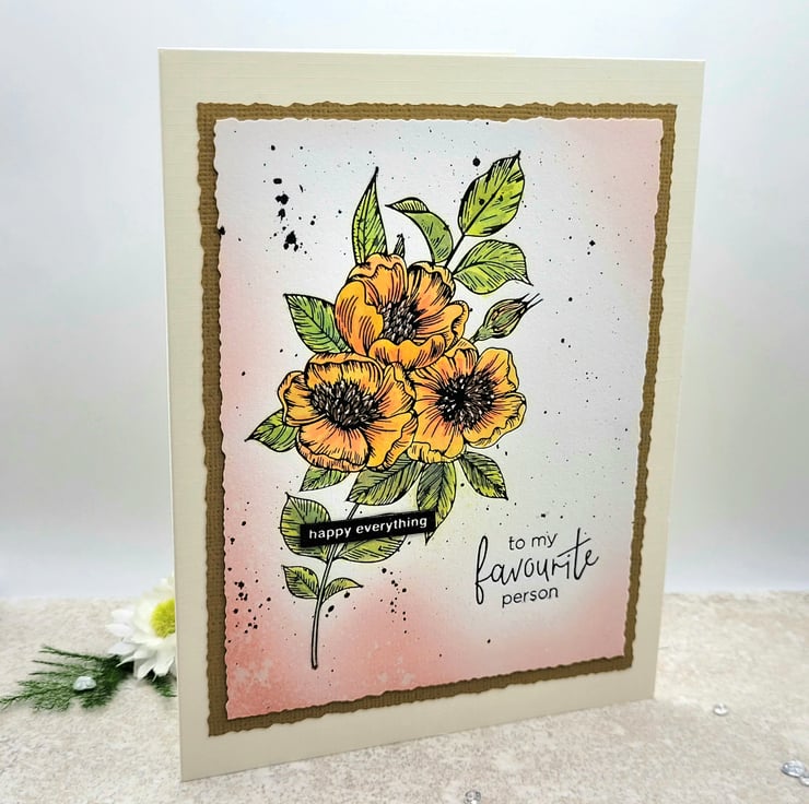 A floral birthday card with a simple yet striking design. The sentiment reads, Happy Everything, to my favourite person! I made this card mostly with birthday's in mind, but it could easily be used for other occasions too. The beautiful floral has been debossed, letterpress style onto 300gsm ivory cotton watercolour panel. This gives the card a luxurious textured feel. I have watercoloured the flowers in warm shades of yellow, gold and orange and there is soft ink blending around the panel. Highlighted with tiny splashes of black archival ink. The handmade card base is from ivory linen card stock with a layer of kraft paper.