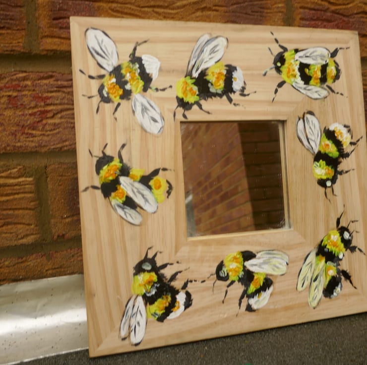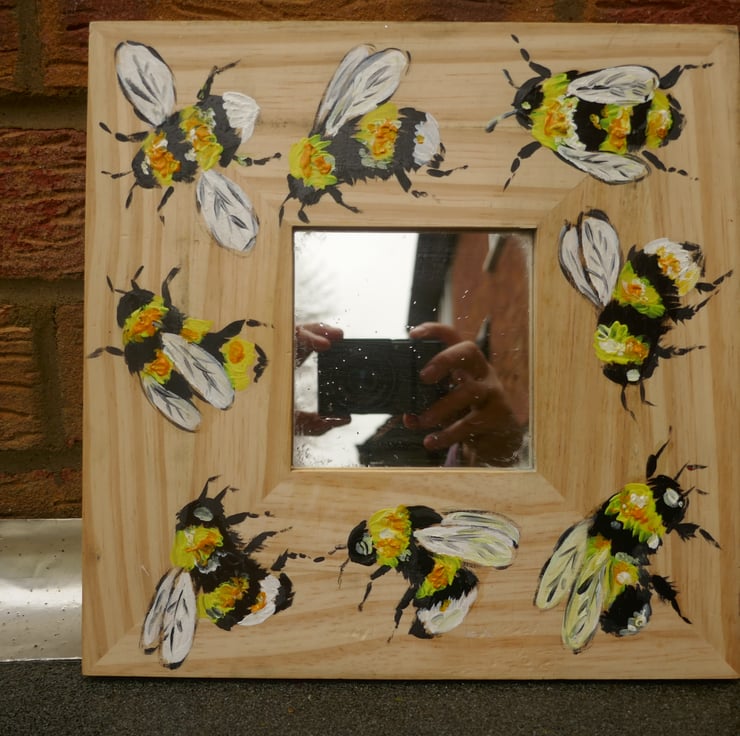 Hand painted square bumble bee mirror measuring 10" x 10" and painted on an Ikea mirror and the bees have been painted in acrylics and varnished. Round hole at the back of the mirror for hanging on the wall on a hook
