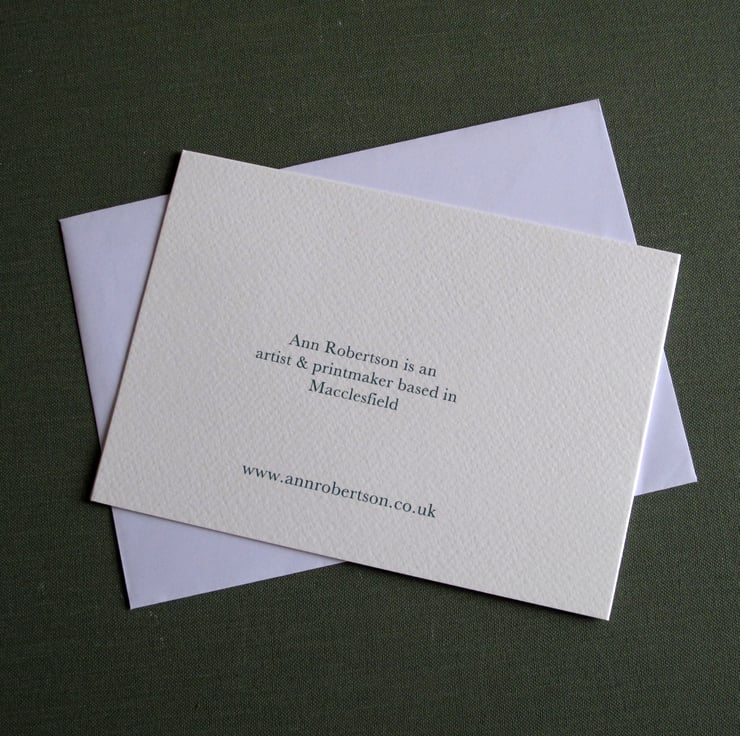 Blank greeting card. Original art work by Ann Robertson. Printed on high quality Tintoretto Gesso paper with a hammered finish. A6 width 14.8 cm height 10.5 cm. Side fold. Plain white envelope.