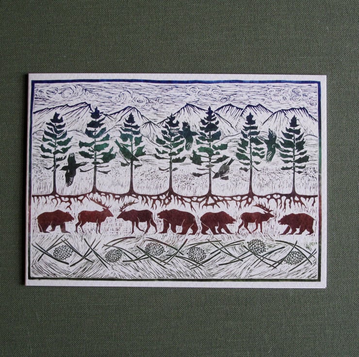 This image is a large original linocut, inspired by Yellowstone National Park. It illustrates some of the animals and birds that live around the lodge pole pines that grow there.