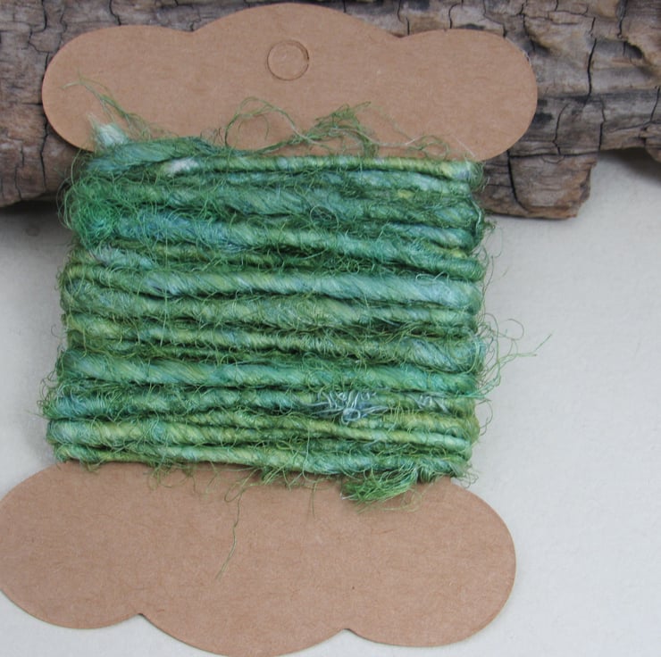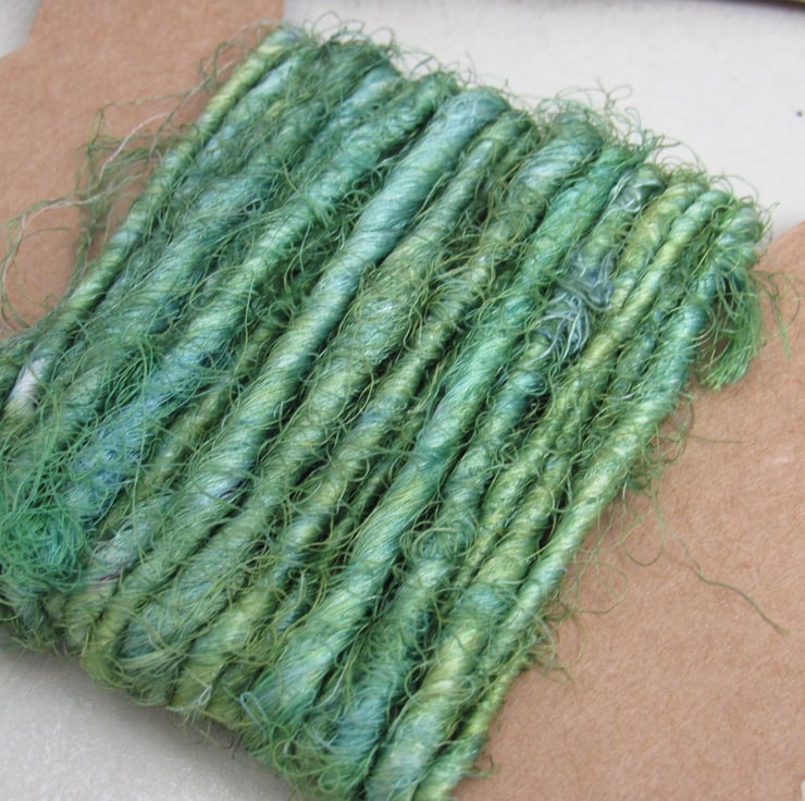 Tightly twisted sari silk yarn, dyed with weld and indigo dyes to give a soft spring green.