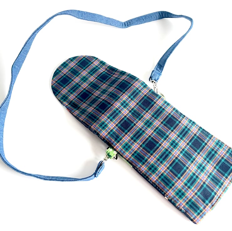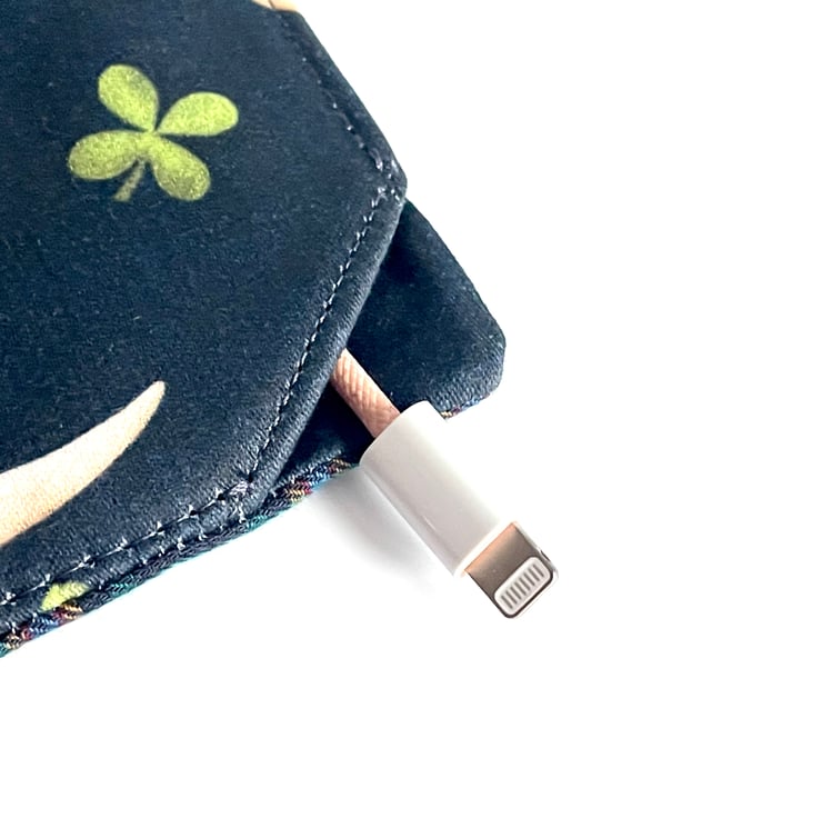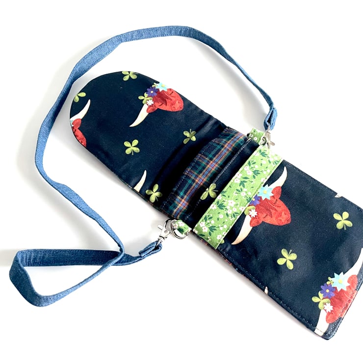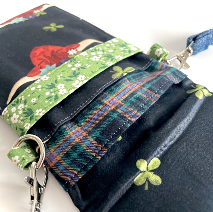 It has been made using high quality quilting cotton which has been lined with padded interfacing for a more protective casing. Beneath the flap are two pockets. The strap can easily be removed and is interchangeable with other straps or lanyards you may prefer to use.