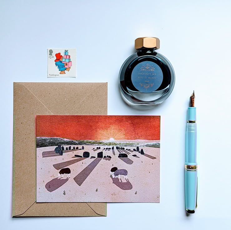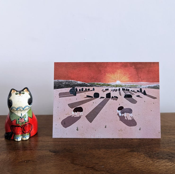 My digital painting of the dawn on the winter solstice at Swinside stone circle in the Lake District, Cumbria, has been printed onto A6-size 350GSM recycled card.