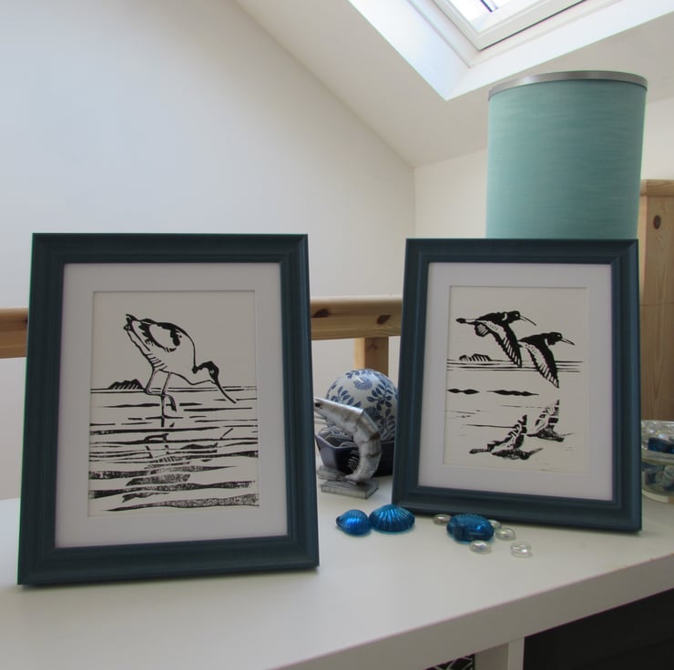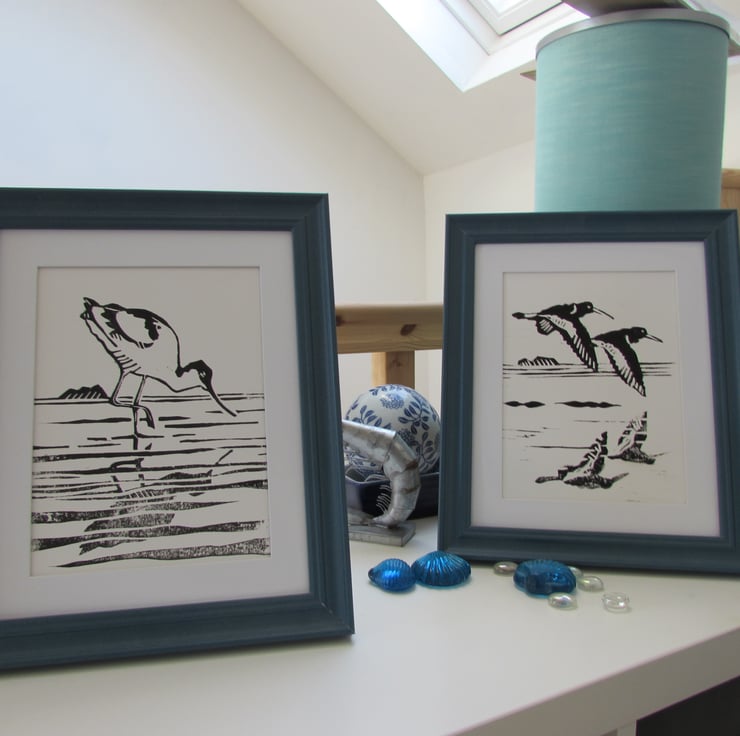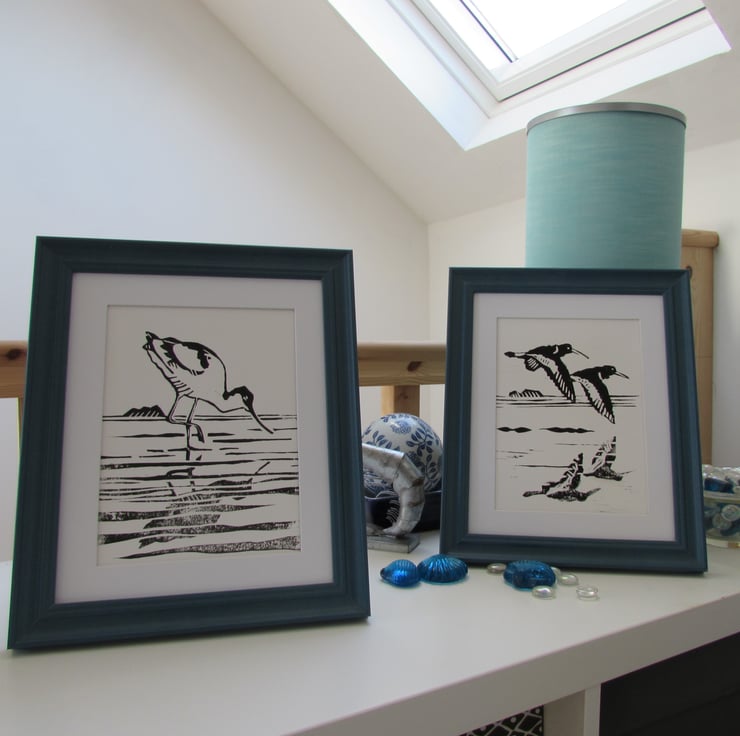 'Reflections' Two Handmade Linocut Prints 'Avocet and Oyster Catchers'  gift