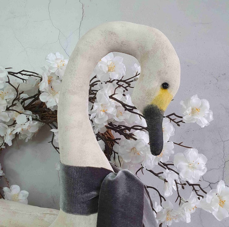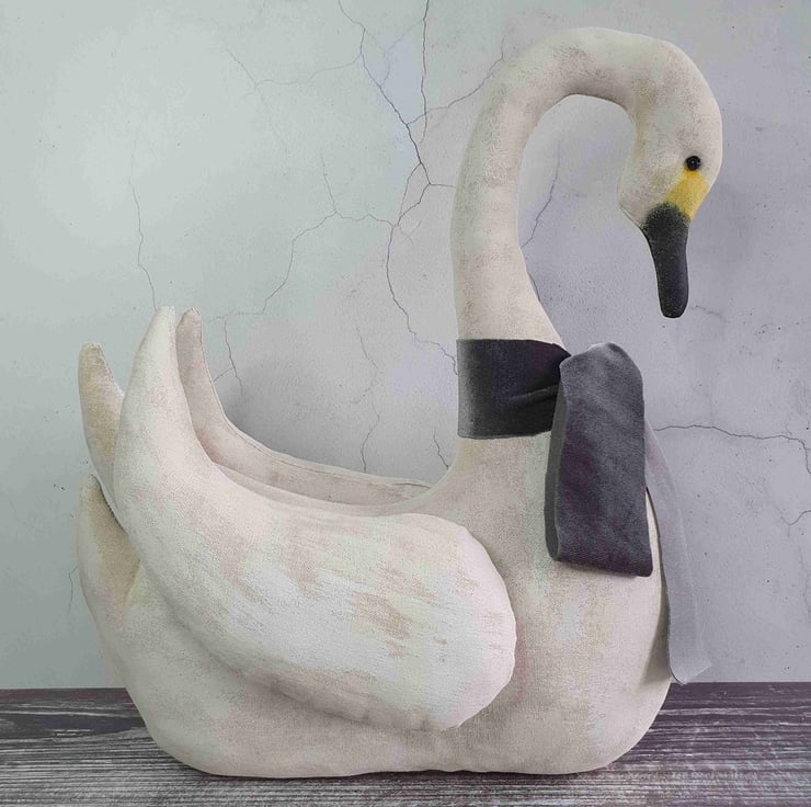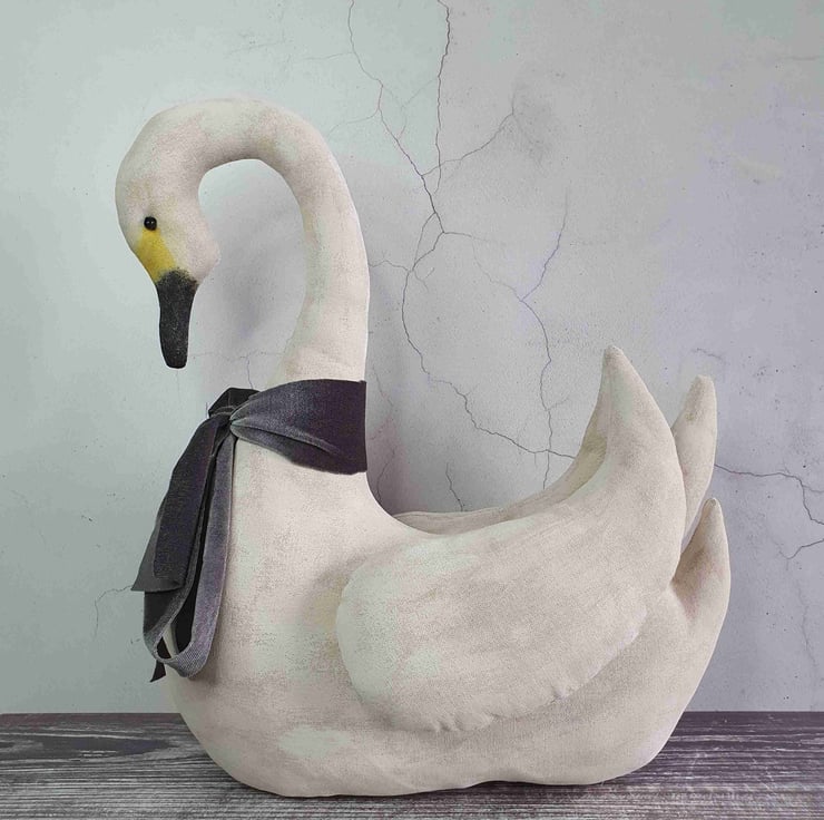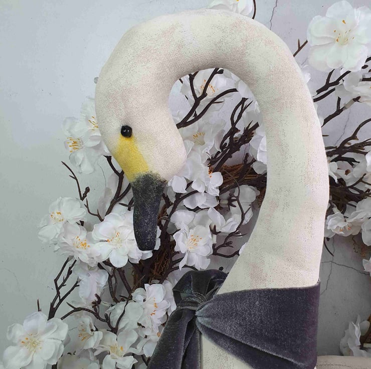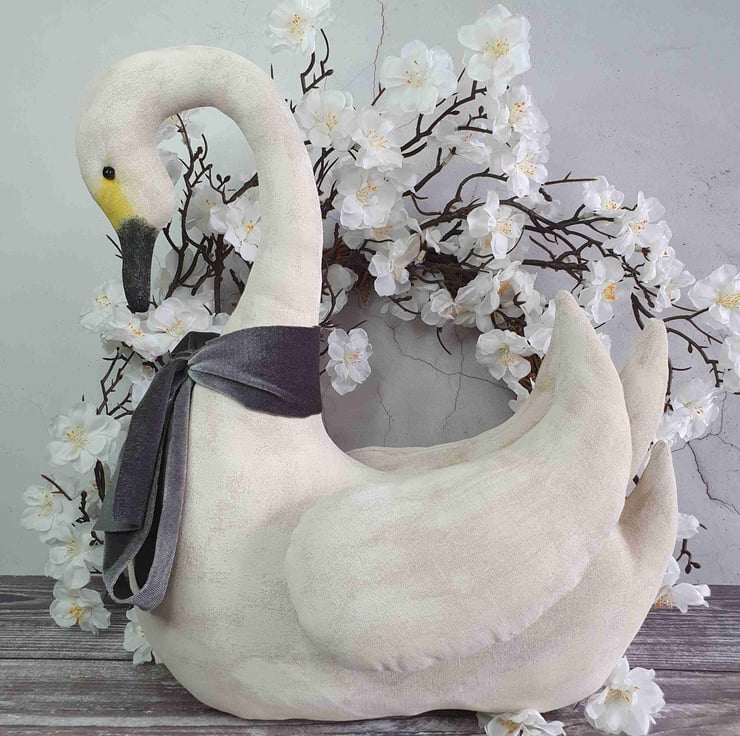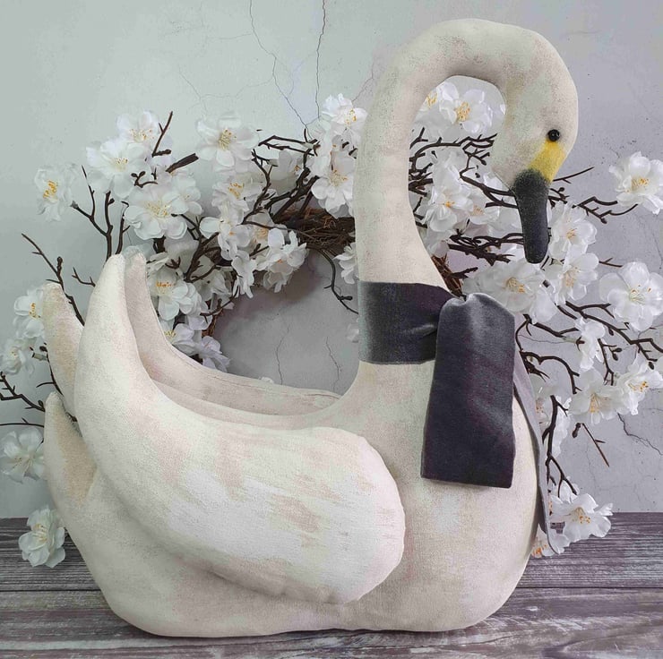 This lovely large primitive style swan has been made out of painted fabric. I age my fabric first with coffee, cinnamon and vanilla. They are then painted with acrylic paint and once dried are sanded down. This gives them an aged wooden look. Around her neck has been tied a handmade grey velvet ribbon. She will look great in your home all year round.