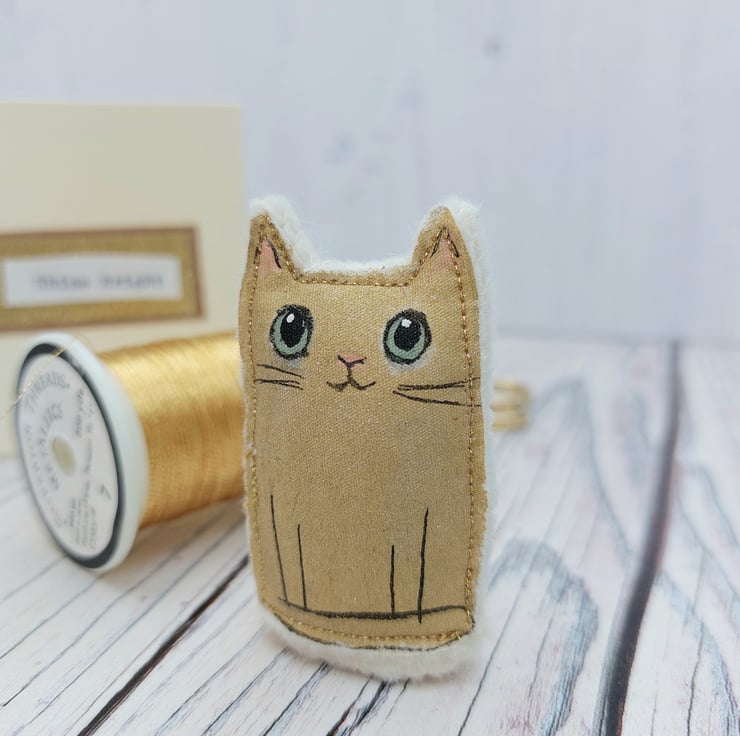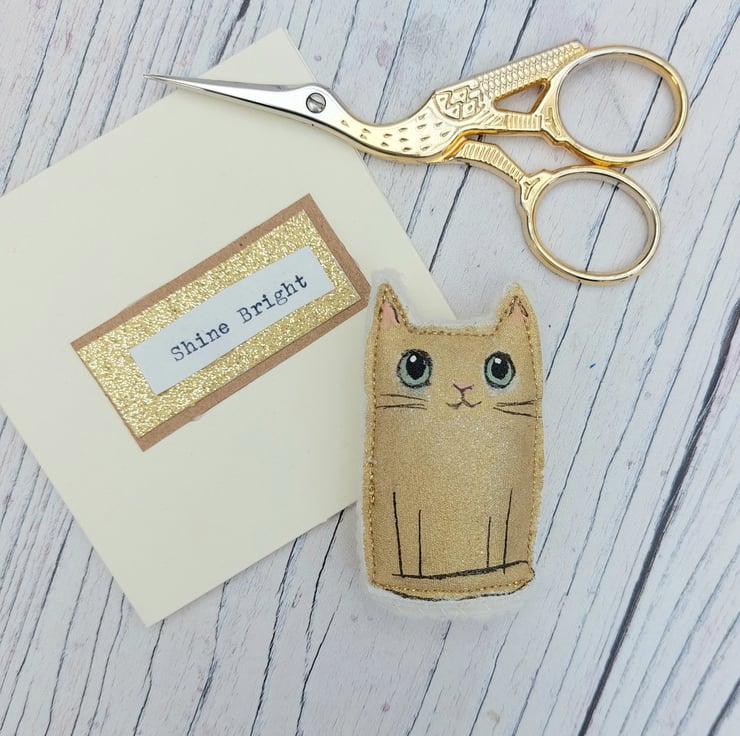 Shine Bright - metallic gold coloured miniature cat made from fabric.
