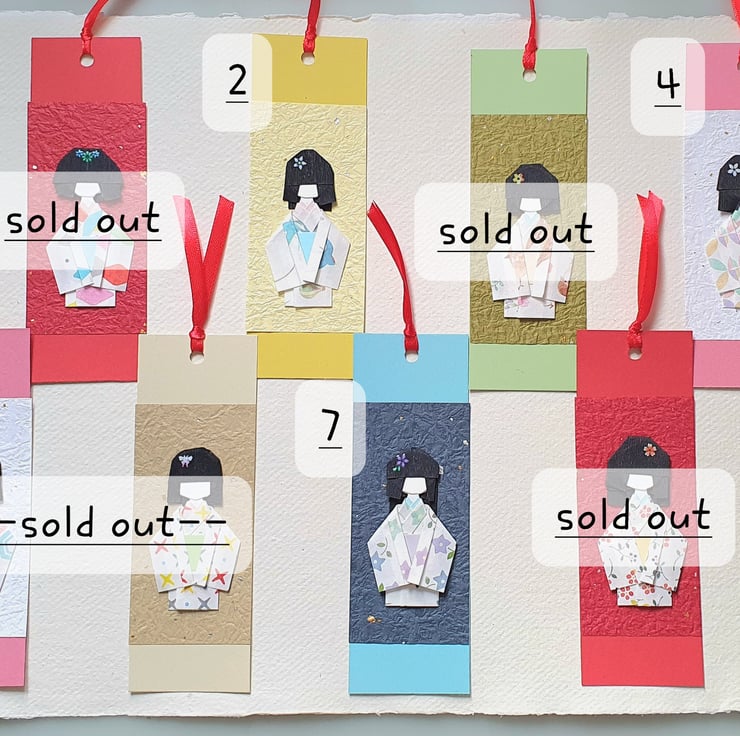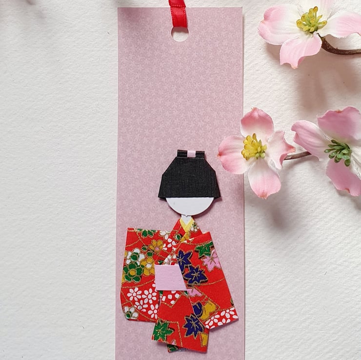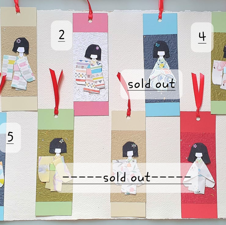 Each bookmark is approx 15cm tall by 5cm wide and features an unique one-of-a-kind japanese paper doll in a traditional kimono.