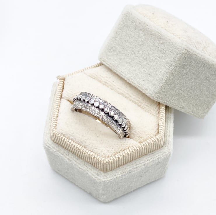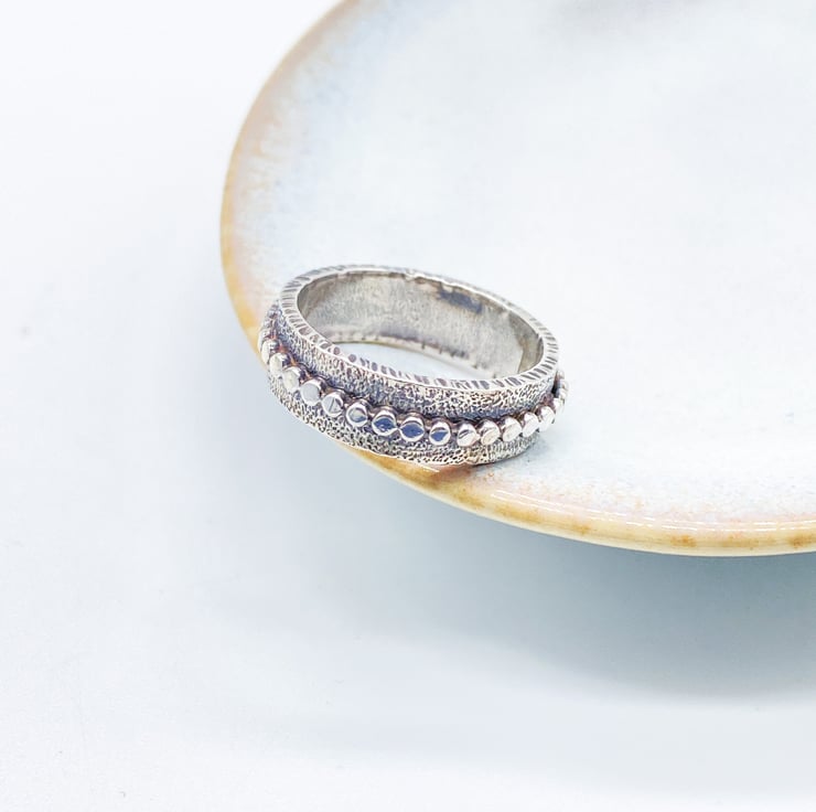 This sterling silver textured and patinated ring is handmade using traditional metal smithing techniques.