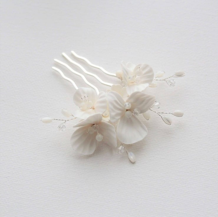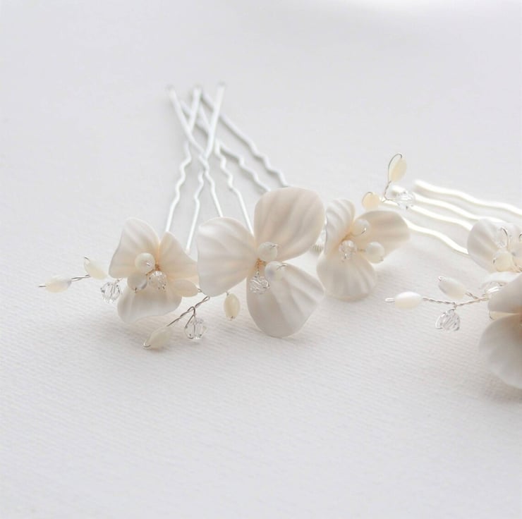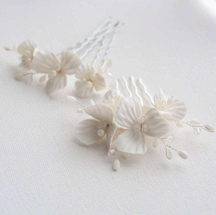 This pretty floral wedding set consists of 4 pieces. Created with off white/pale ivory clay floral detail, mother of pearls and crystals. The set consists of a bridal hair comb and 3 matching bridal hair pins that perfectly compliment the hair comb. The set is finished in a silver tone.