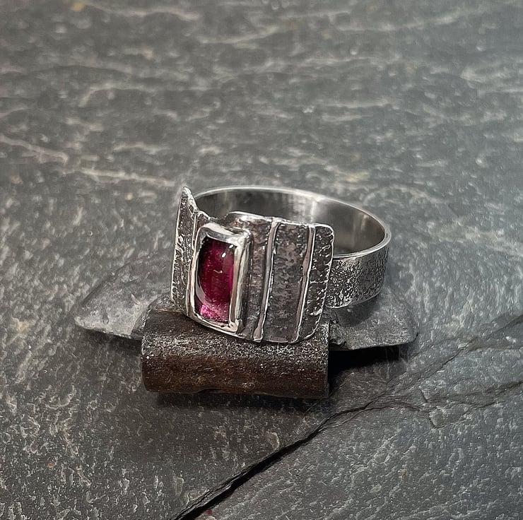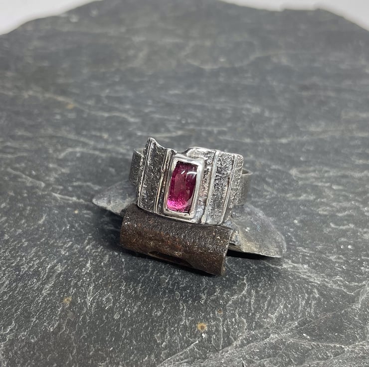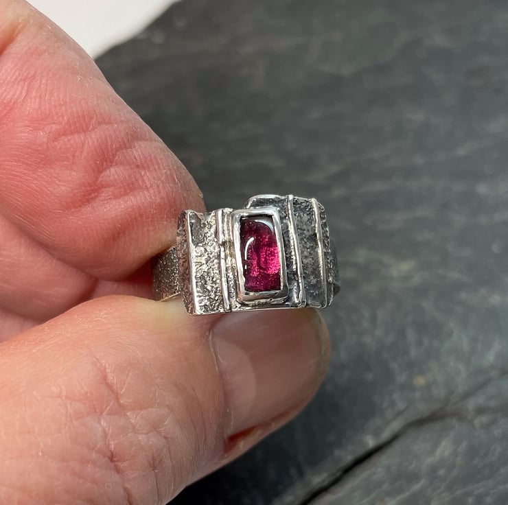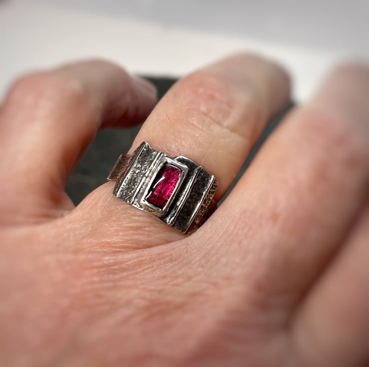 An oxidised silver statement ring, set with a rectangular garnet.