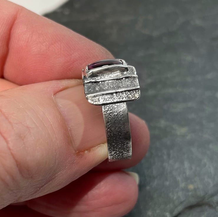 The front of the ring is wider than the band, it is loosely rectangular, but has one “eroded” freeform edge. It has fused wires that echo the shape of the stone.