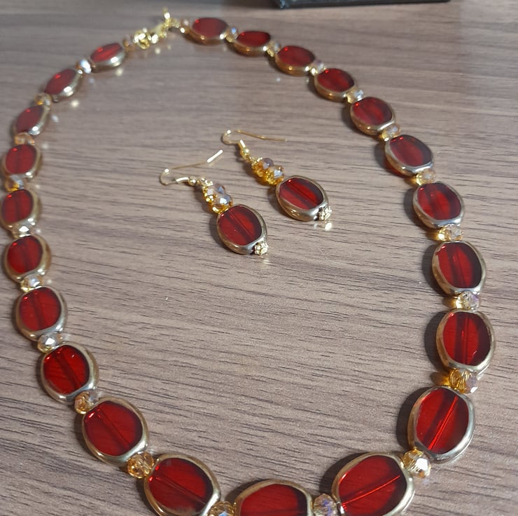 UNIQUE HANDMADE ONE OF A KIND RED GLASS AND GOLD PLATED BEAD NECKLACE AND EARRING SET.