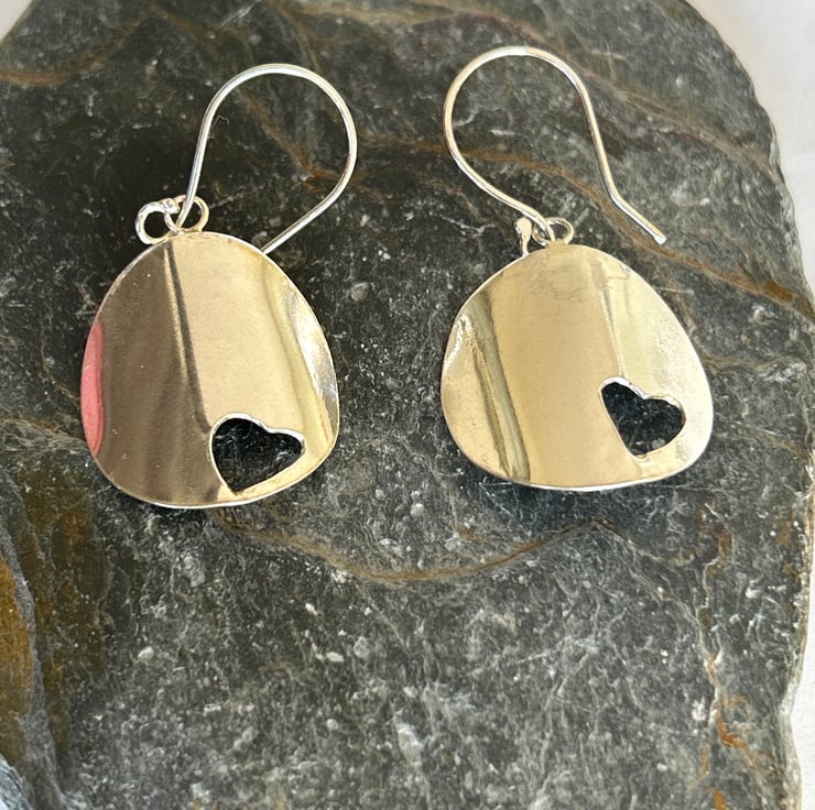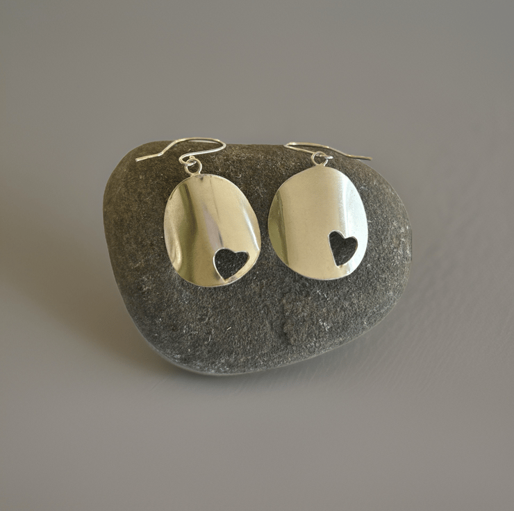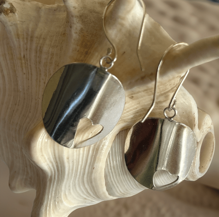 These stunning artisan circular eco-friendly recycled sterling silver earrings have a slight domed shape, handcrafted with a unique heart design for a bohemian touch. The ear hooks are handmade with sterling silve. These earrings are 30cm in diameter and have a 4cm drop. Perfect for all occasions. Handmade in Woolacombe North Devon.