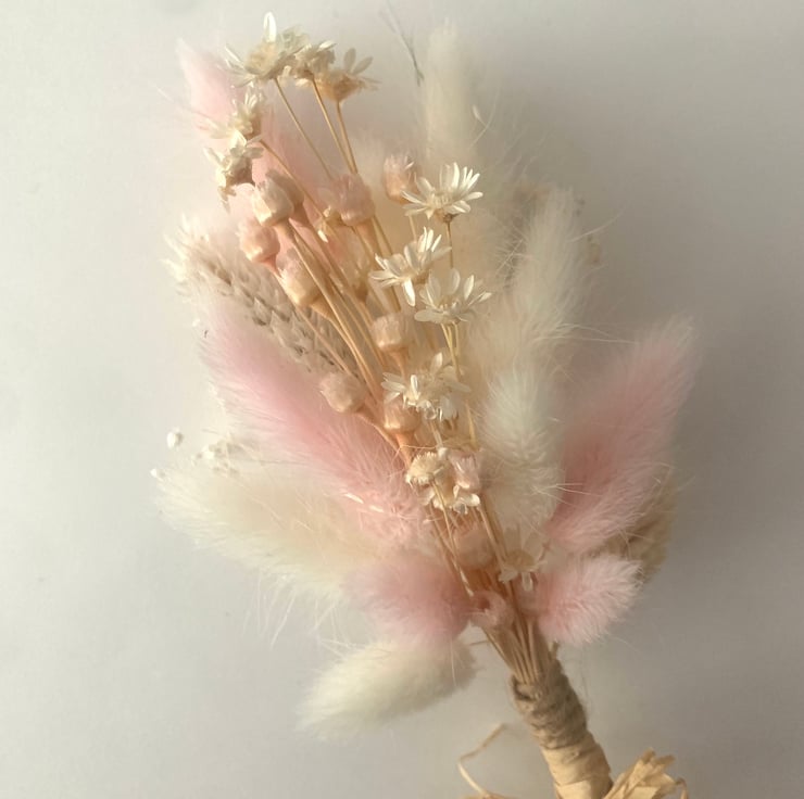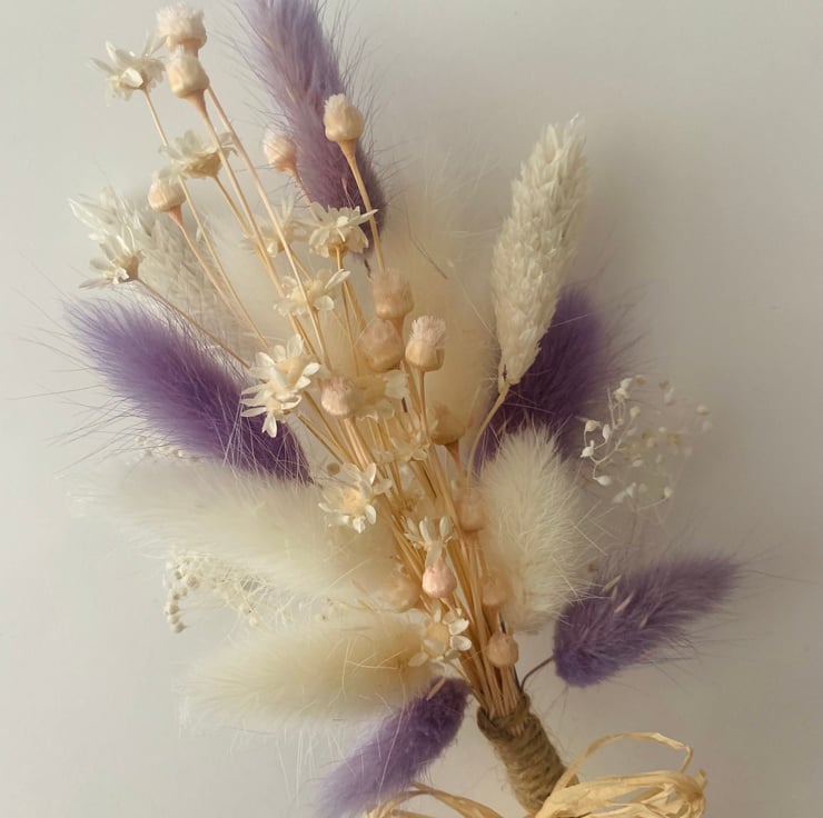 These dried flower arrangements, available in a choice of four pretty colourways including sage grey, pastel pink, lavender lilac and mid pink, are mixed with soft pastel light pink, white and neutral stems. These are hand tied with string and finished with raffia and, with a selection of stems, each posy contains a assortment of complementing dried flowers, as shown in the images. Designed as a flat backed forward facing posy style, these can be suitable for many occasions, including as a special gift to treat yourself.