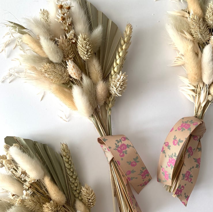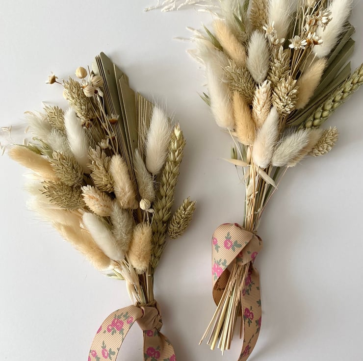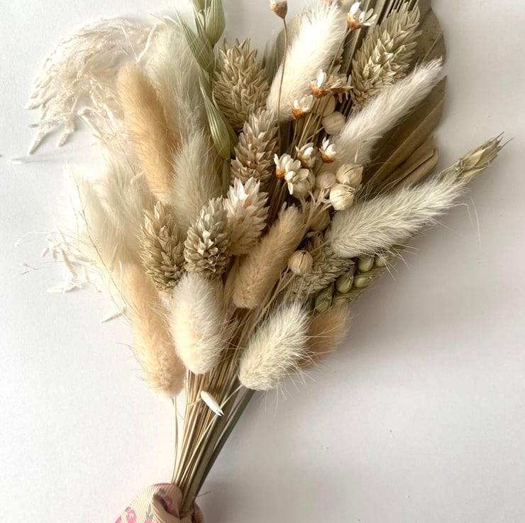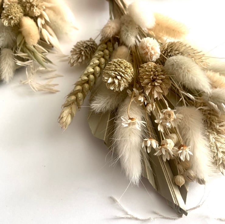 This arrangement of dried flowers is backed with a mini sage dried palm spear. The selection with neutral stems includes sage greens, ivory, ecru and warm whites with soft greys including bunny tails, dried wheat, dried oats, canary grass, flax, briza grass and star flowers which is hand tied with floral grosgrain ribbon. This flat backed forward facing arrangement can be suitable for many occasions and celebrations.