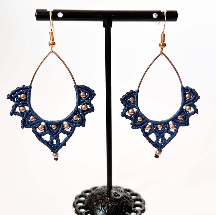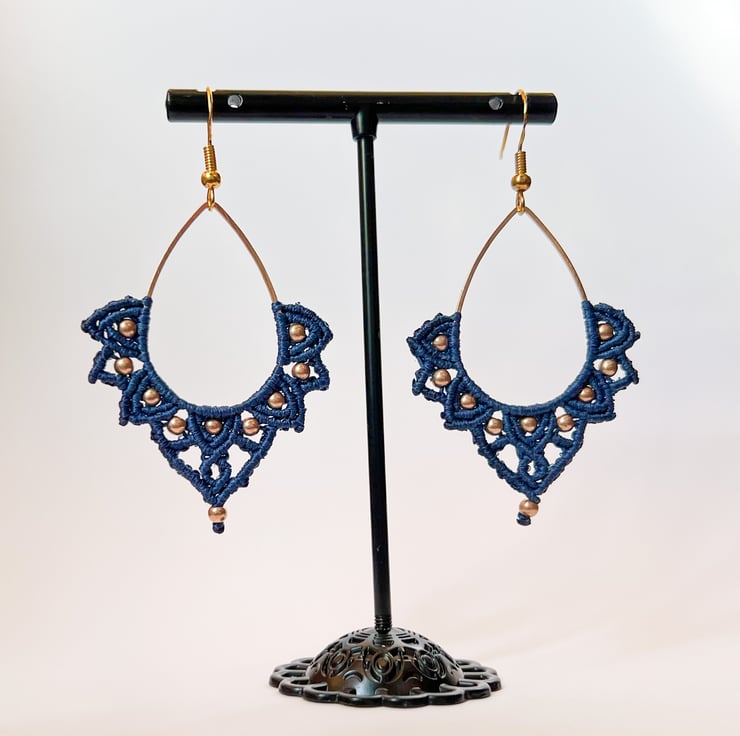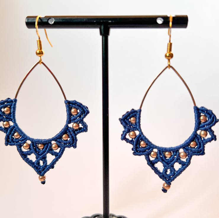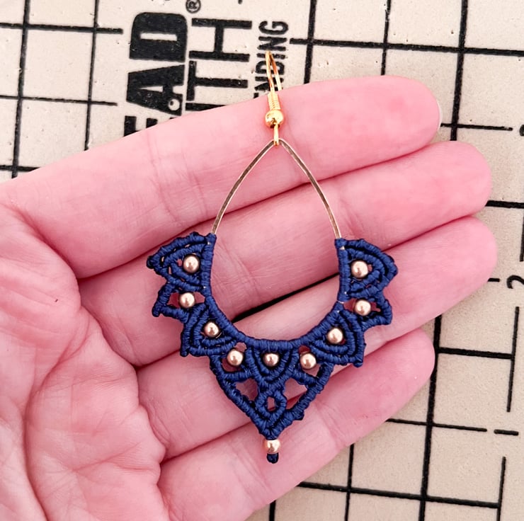 Macrame mandala pattern is made by waxed thread attached and knotted onto gold coloured shaped hoops.