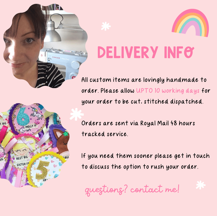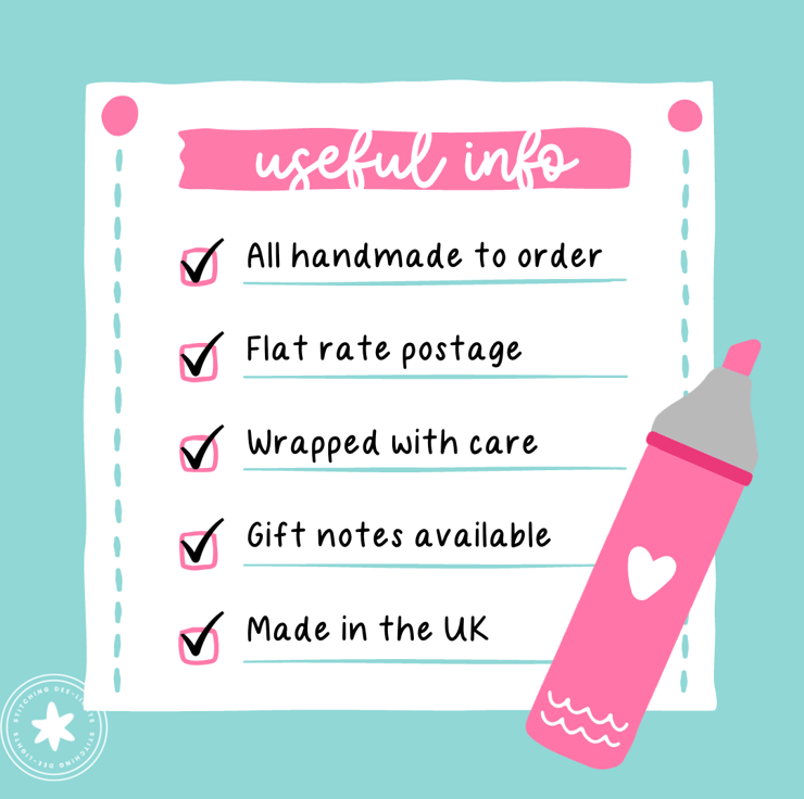 This item is made-to-order and will be posted to you by Stitching Dee-lights within 14 days of receiving payment.