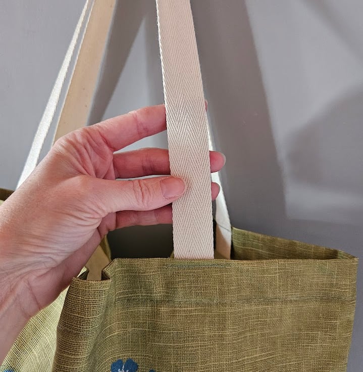 The over-the-shoulder cotton webbing handles measure 58cm, end-to-end.