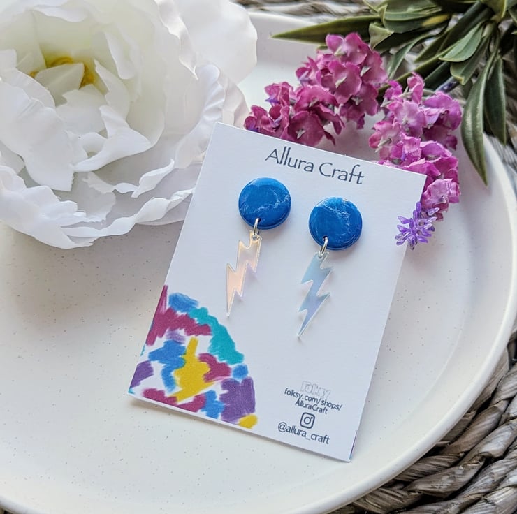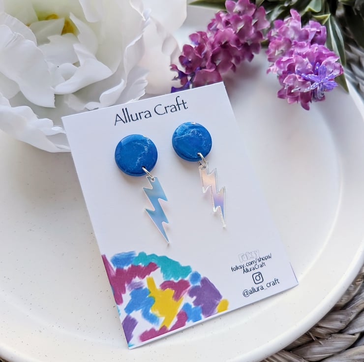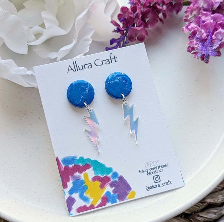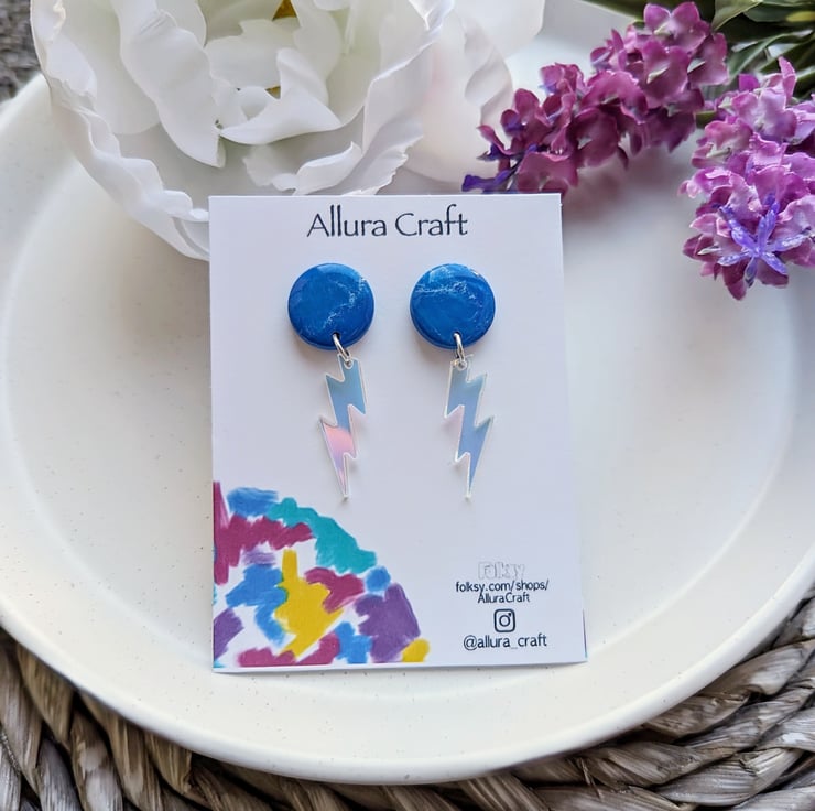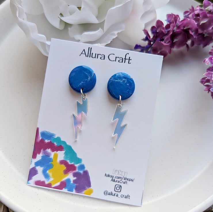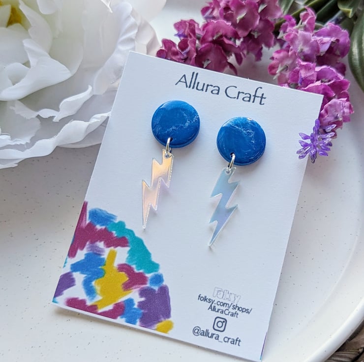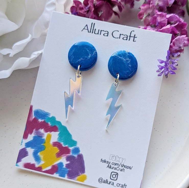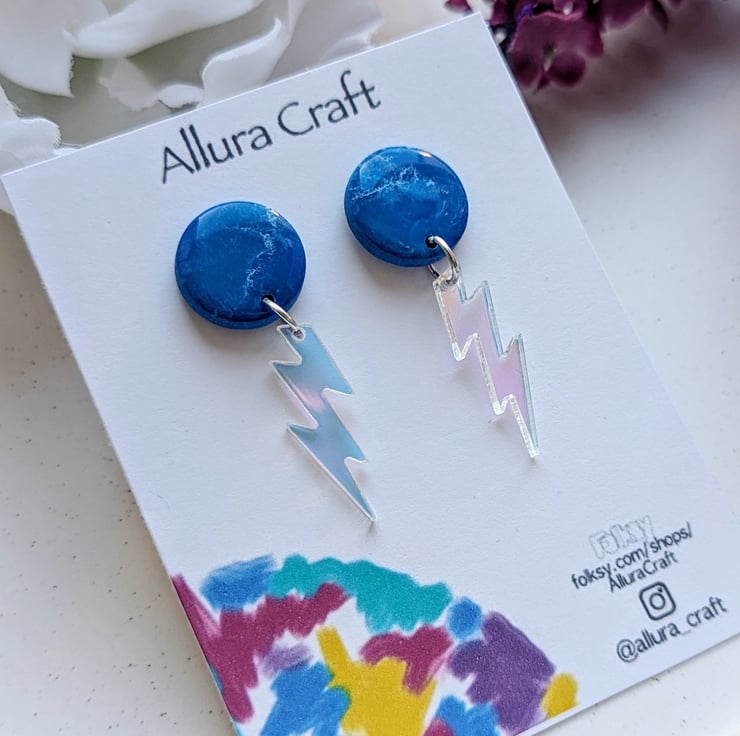 Attached to a slim double sided irridescent three tier lightning bolt in super lightweight acrylic