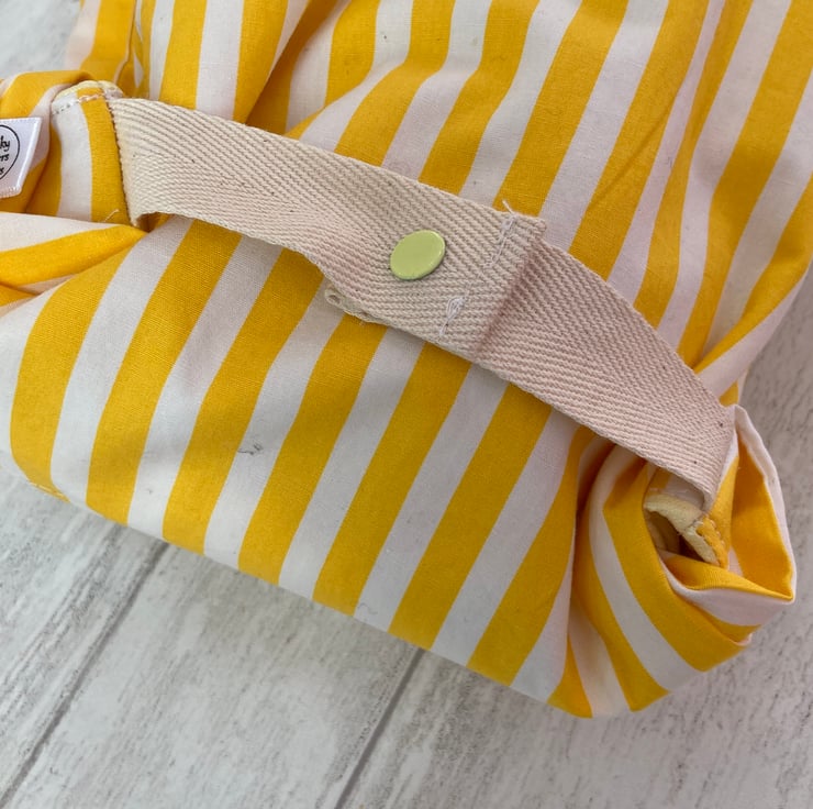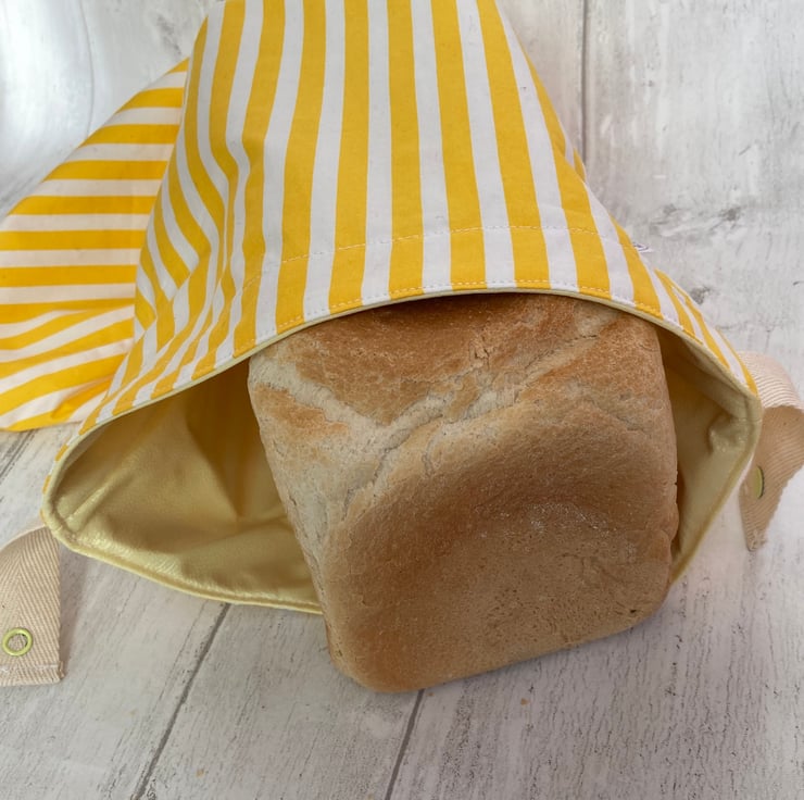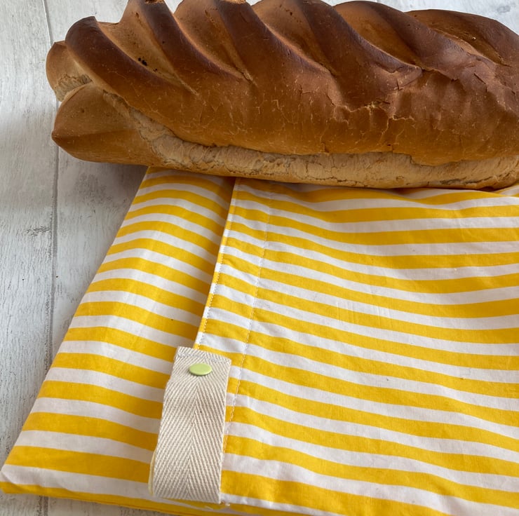 LARGE: 27 x 50cm - should accommodate larger sandwich loaves and bloomers. The popper fastening can be folded down when the loaf is smaller or partially used. These are made from yellow and white striped cotton, lined with yellow PUL. Other fabrics are available.
