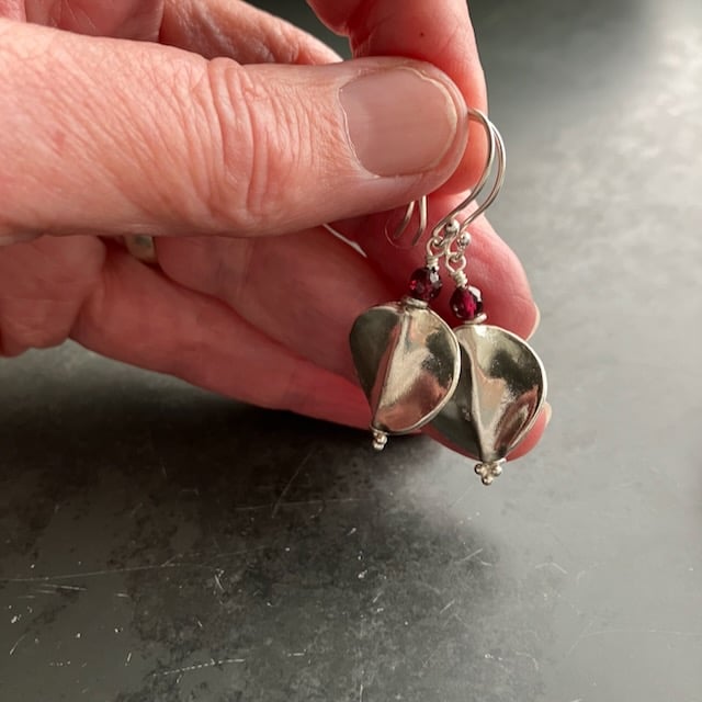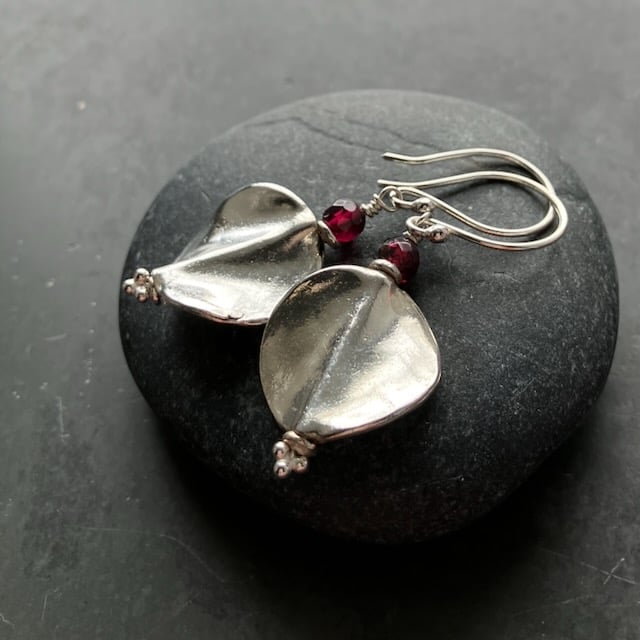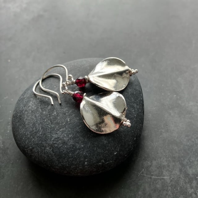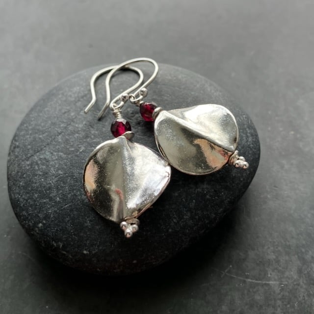 These drop earrings use a fine silver twisted lentil bead with little sterling silver beads top and bottom. They are finished with a little garnet bead and the ear wires are hand made by us. The moon shaped flattened beads measure 1.7cm and the drop from the bottom of the hook is 3cm. The undulations mean that they reflect the light in a pleasing way.