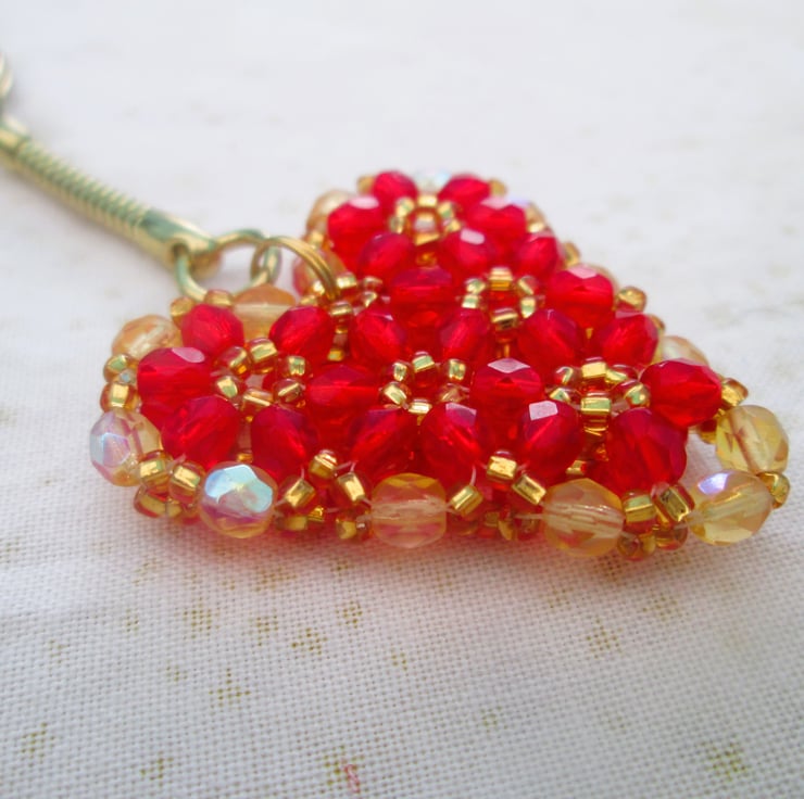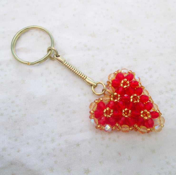 A pretty heart keyring using fire polish beads, and seed beads. The heart pendant is double sided and has a pillow like effect. The keychain is gold plated.