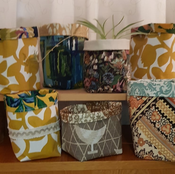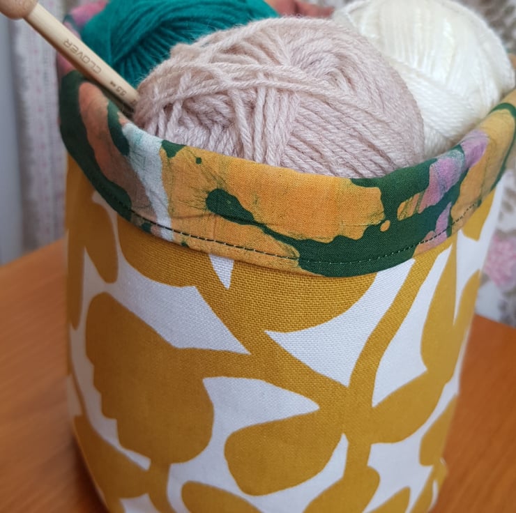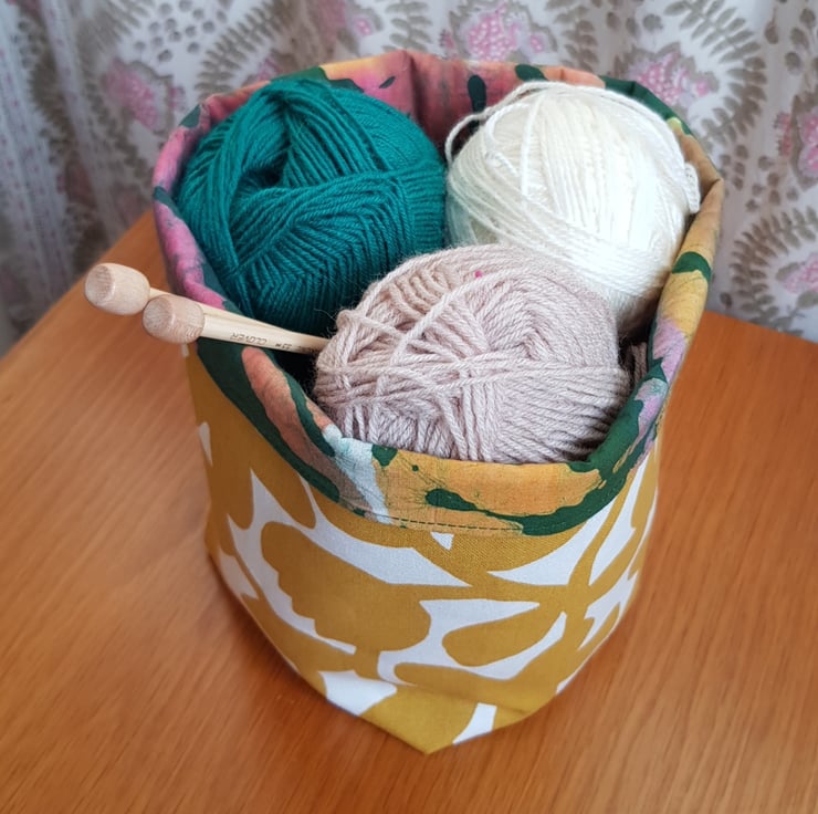 Wanting to have a spring clean? This storage "basket" has a multitude of uses. I like to use mine for yarns. It would look with a house plant in it. The fabric is a furnishing weight print which I have interlined to give some rigidity and the basket is lined with a coordinating batik fabric.