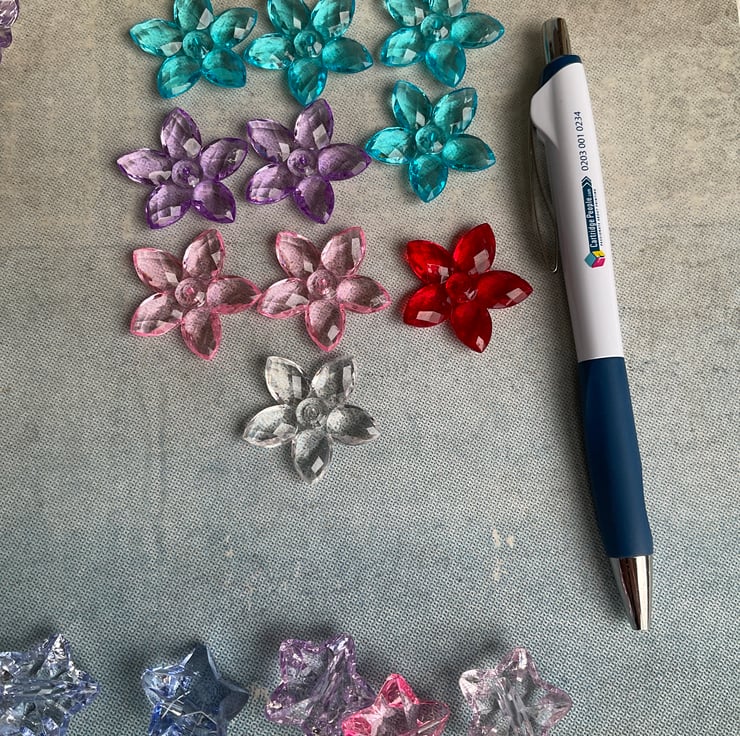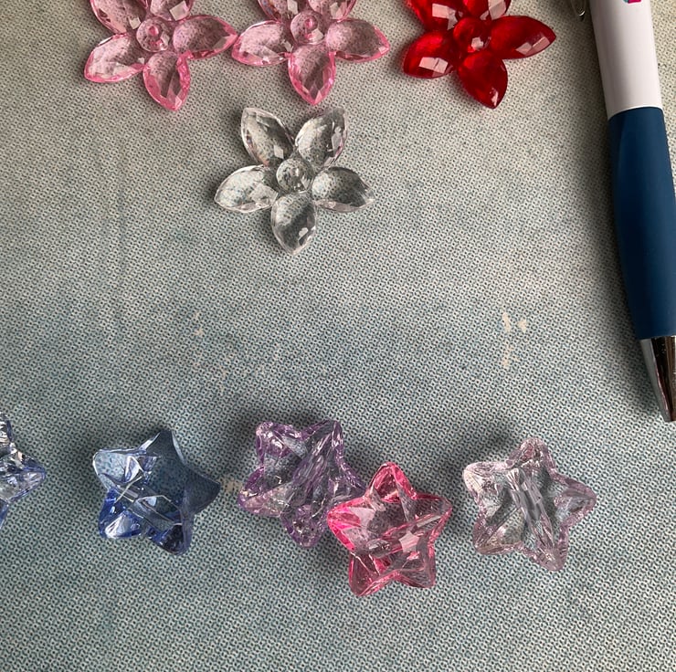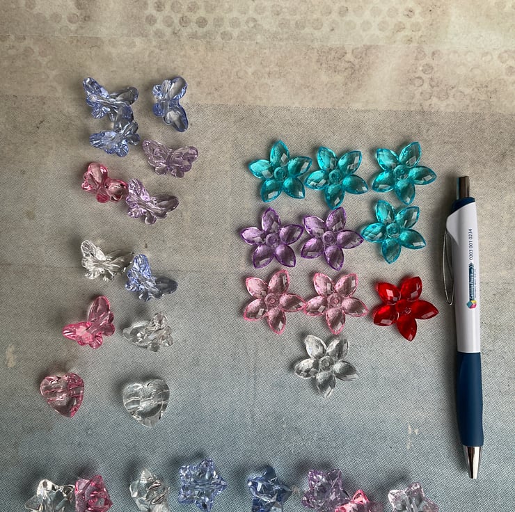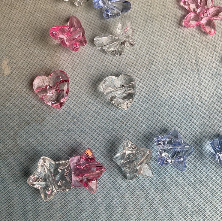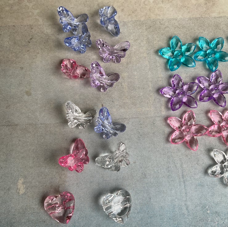 A mixed lot of plastic flower, star, heart and butterfly beads perfect for crafting.