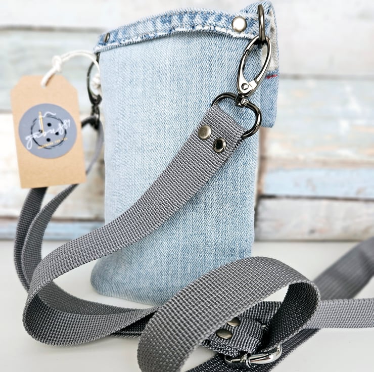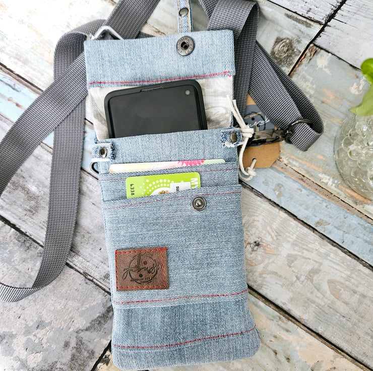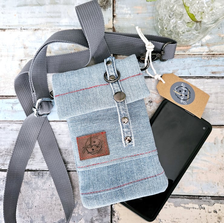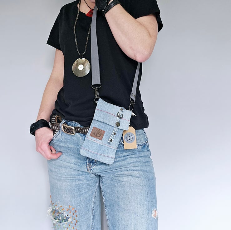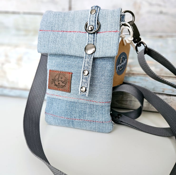 A light-colored denim crossbody phone bag is an ideal accessory for individuals with active lifestyles. This bag features an adjustable strap for a comfortable fit, allowing easy access to essential items. Crafted from upcycled denim, it demonstrates a commitment to sustainability.