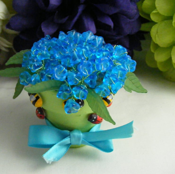 This lovely handmade bluebells flower decoration would make a great gift for the home. I've painted a terracotta pot with green acrylic paint and glued a piece of green felt to the bottom of the pot. 9mm blue glass flowers and 25mm green leaves are twisted on chartreuse wire and set in oasis and glue. Outside the pot is decorated with wooden ladybirds and bees. A light blue ribbon is tied around the pot.