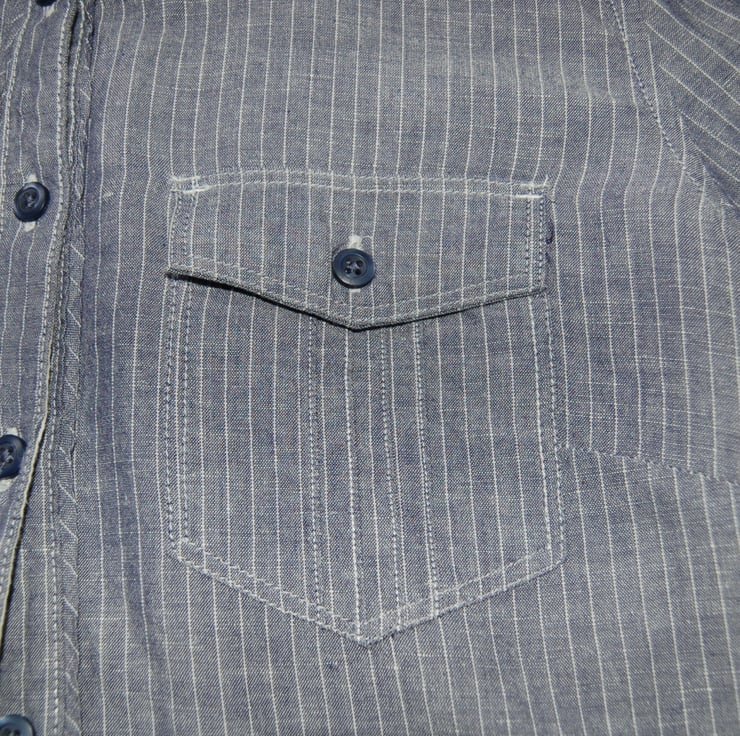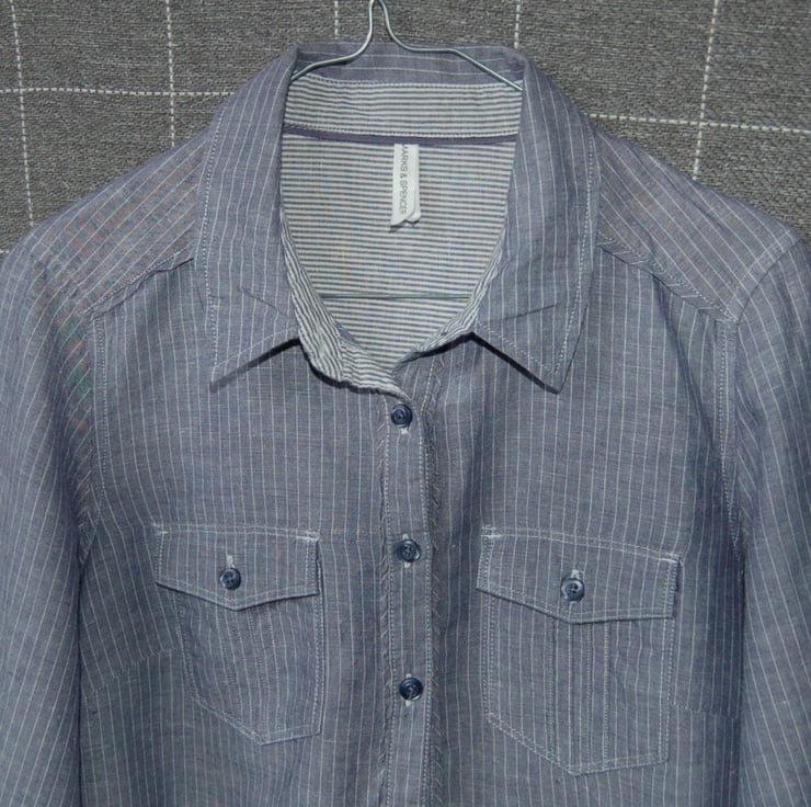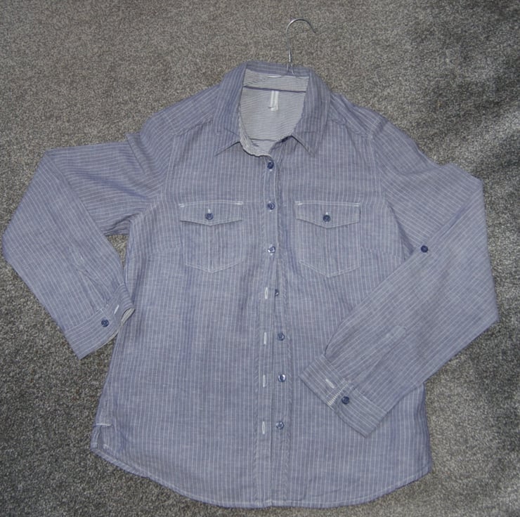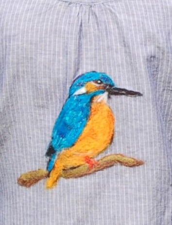 A ladies size 12 M&S grey pin striped shirt upcycled with a needlefelt Kingfisher on the back. A one of a kind item that is so special. Fabric is a lovely soft cotton and linen blend.
