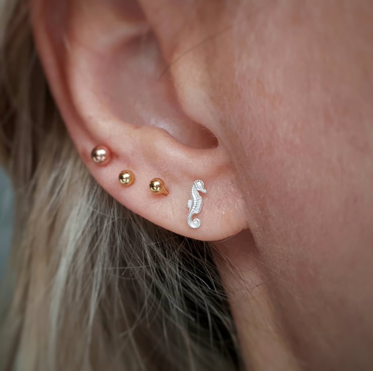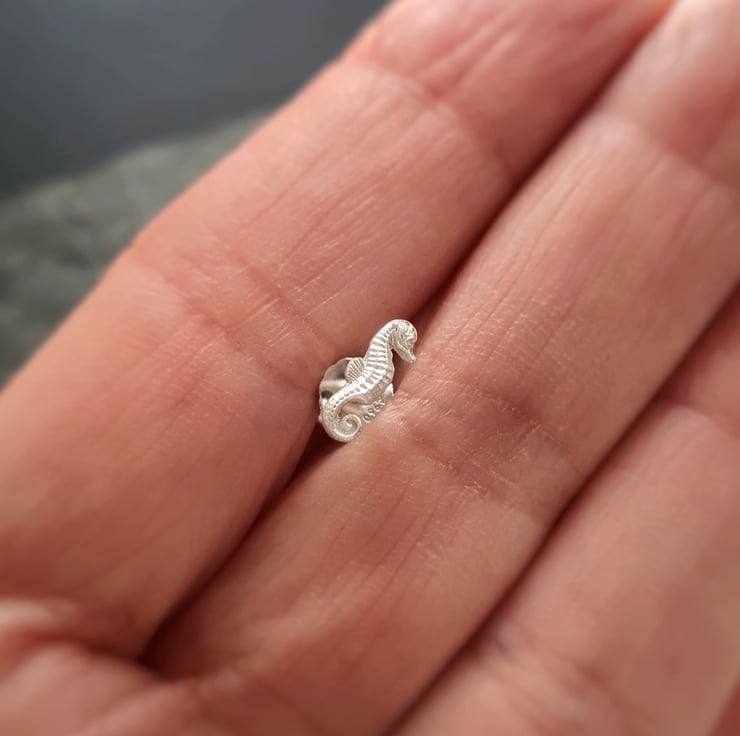 Each of these seahorse stud earrings is made by hand in hypoallergenic sterling silver called Argentium silver. Argentium sterling silver contains more pure silver than traditional sterling and, unlike traditional sterling, it doesn't contain any copper, making it perfect for people with allergies and those who can't wear traditional sterling. Both the seahorse as well as the post and butterfly back are made from Argentium.