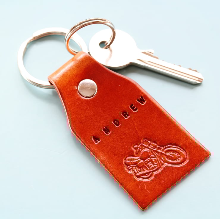 These Motorcycle personalised leather keyrings are custom-made from premium quality leather and can be personalised with 6 capital letters of your choice. I will hand-dye the leather key fob brown on the front and on the reverse.