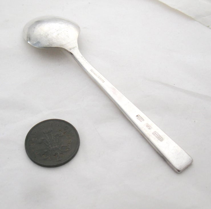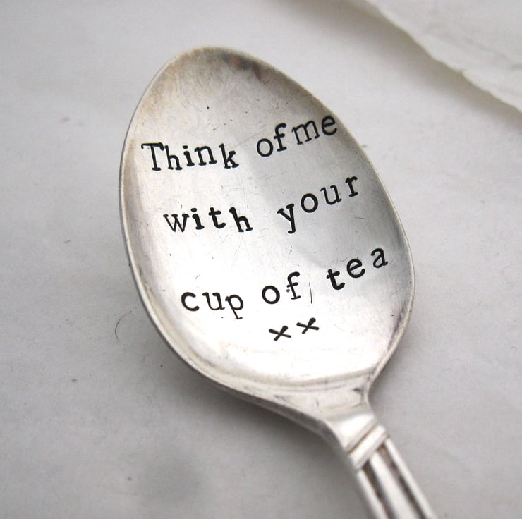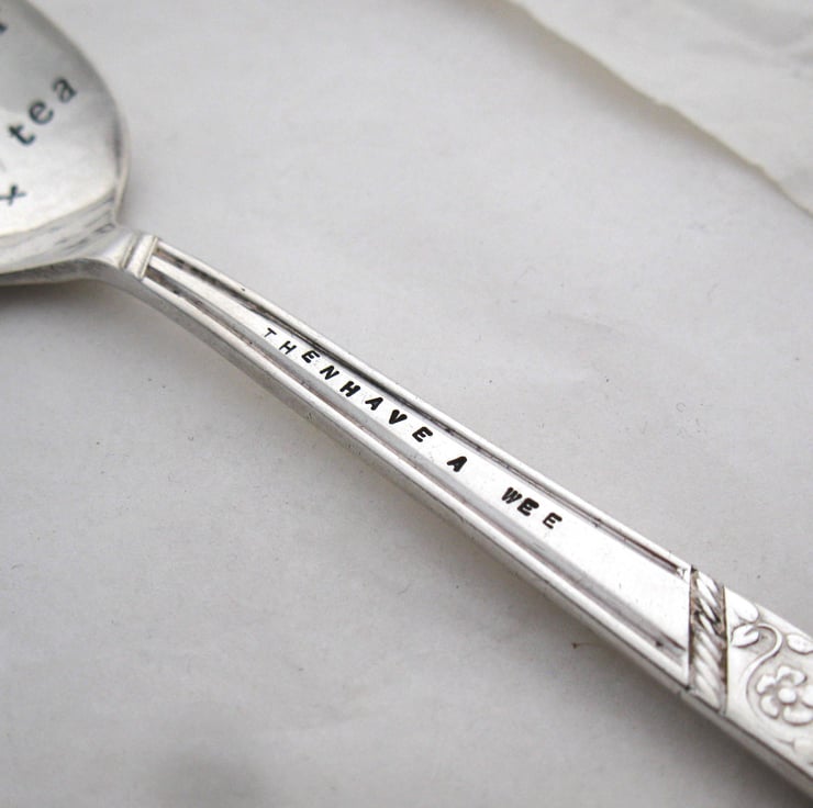 A vintage silver plated (EPNS) tea spoon, handstamped with 'Think of me with your cup of tea xx' in the bowl... and I couldn't resist adding 'THEN HAVE A WEE' in tiny block letters on the handle. Unfortunately I had my old glasses on and the spacing didn't come out quite right, so it's in the bargain bin for a fiver (less than half my usual price).