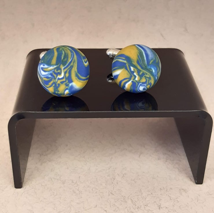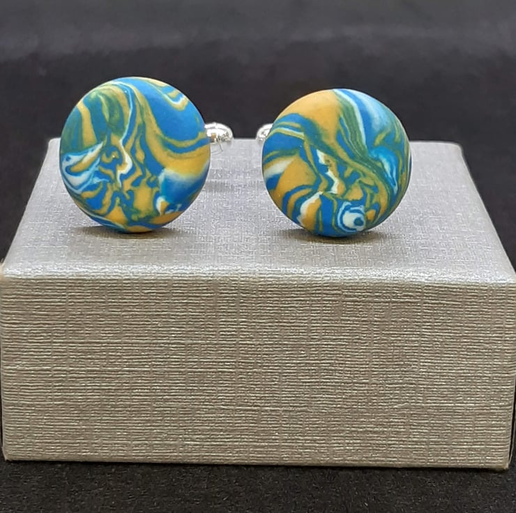 Handmade cufflinks using a mixture of blue, mustard yellow and white polymer clay to create this unique swirl design.