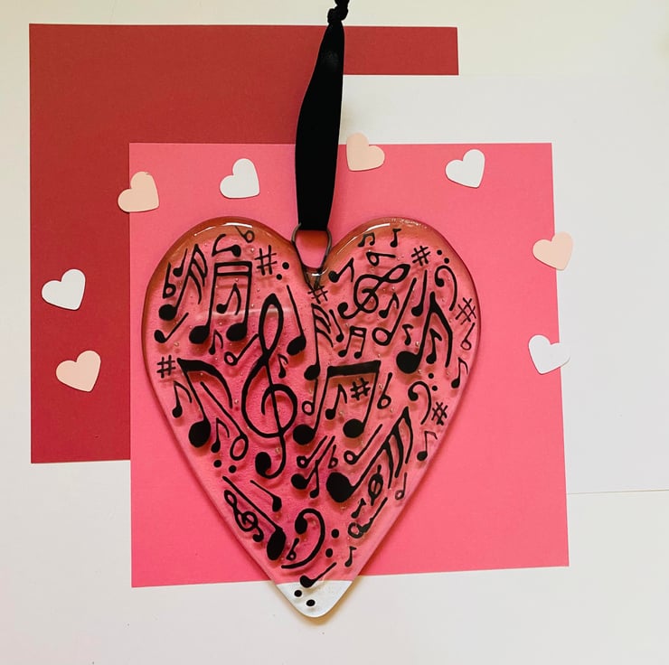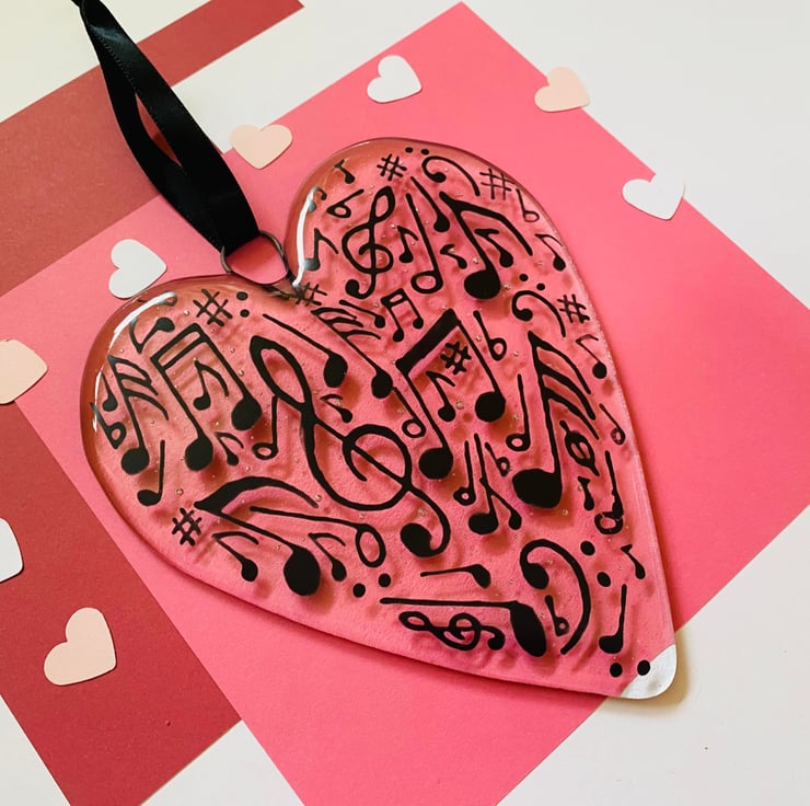 This Fused Glass Hanging heart has been hand painted with music notes. This is the perfect gift for any music lover, musician. It will be perfect Valentines gift but can be kept up all year around.