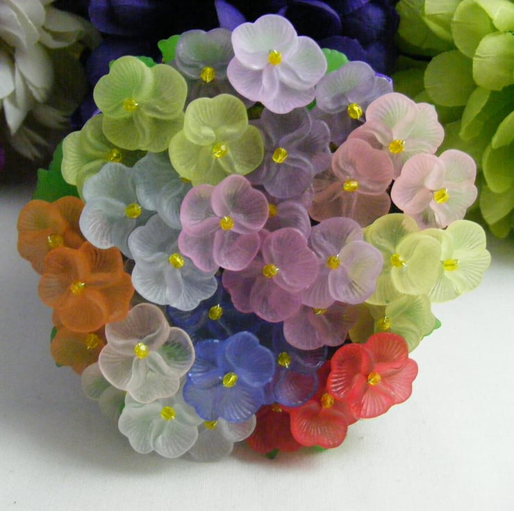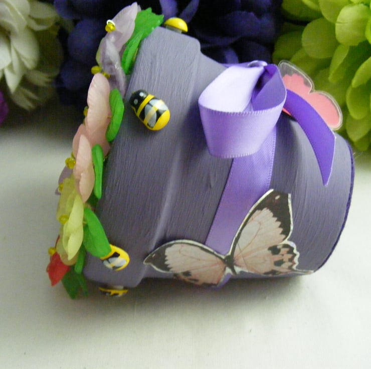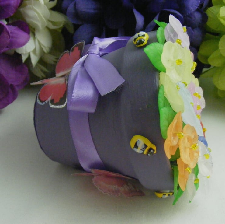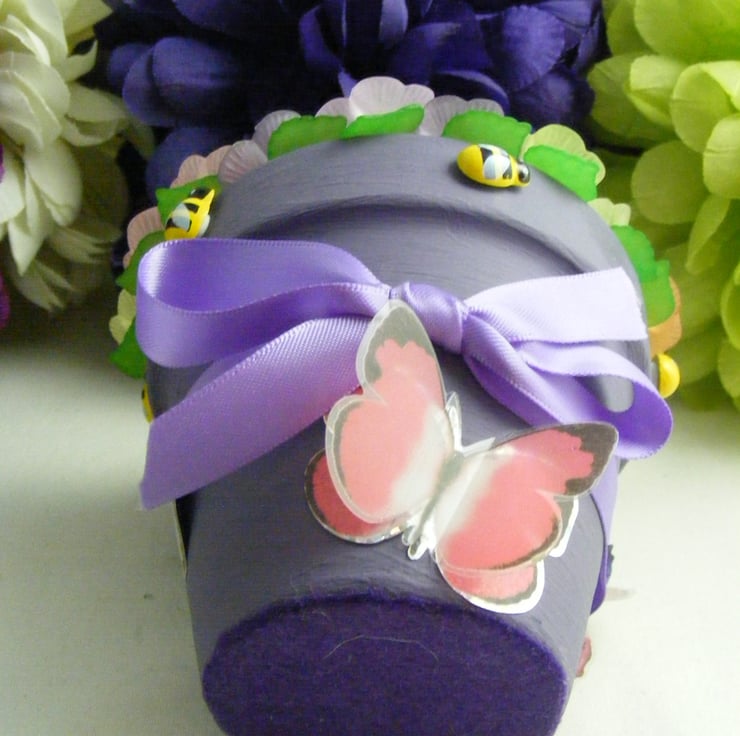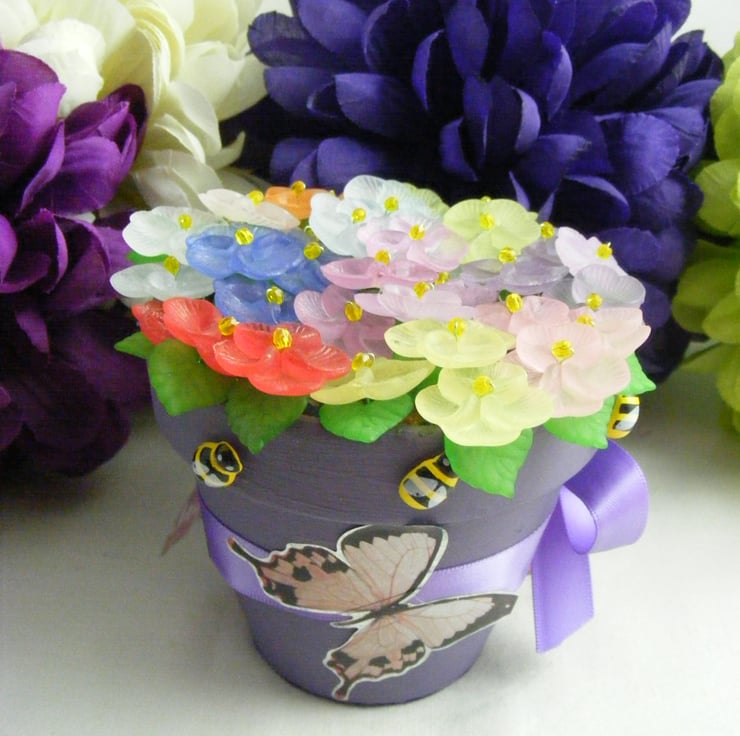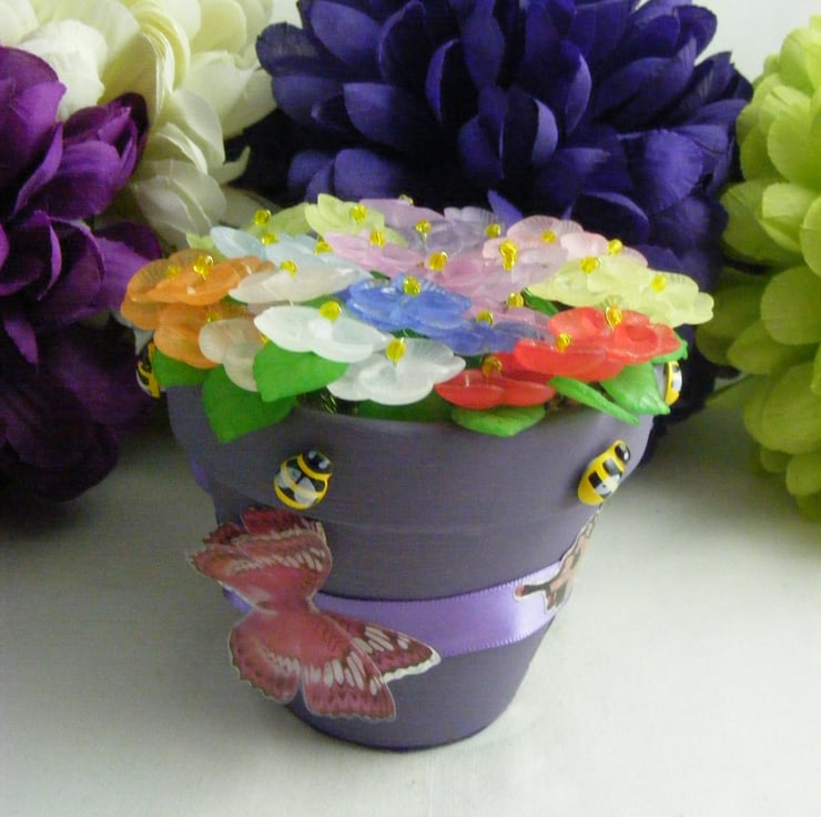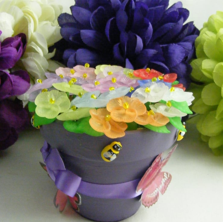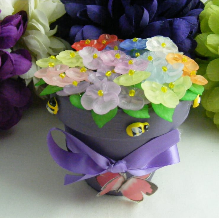This lovely handmade pot of pansies would look lovely in any room. Also perfect for gifting. I've painted a terracotta pot with purple acrylic paint and glued purple felt on the bottom of the pot 20mm mixed colour lucite pansy flowers, 4mm yellow firepolish beads and 15mm green lucite leaves are threaded onto chartreuse wire. Flowers are set into the pot with oasis and glue. I've decorated the outside of the pot with, wooden bees, stick on butterflies and tied a purple ribbon around the middle of the pot.