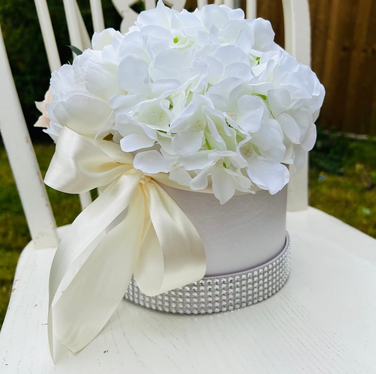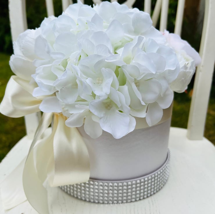 Luxury hatbox with silk artificial flowers hydrangeas.