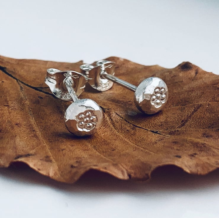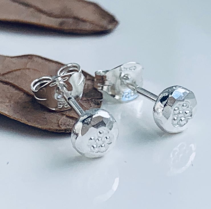 Little 4 mm stud earrings are made from recycled silver, hammered and textured, slightly mis-shaped.
