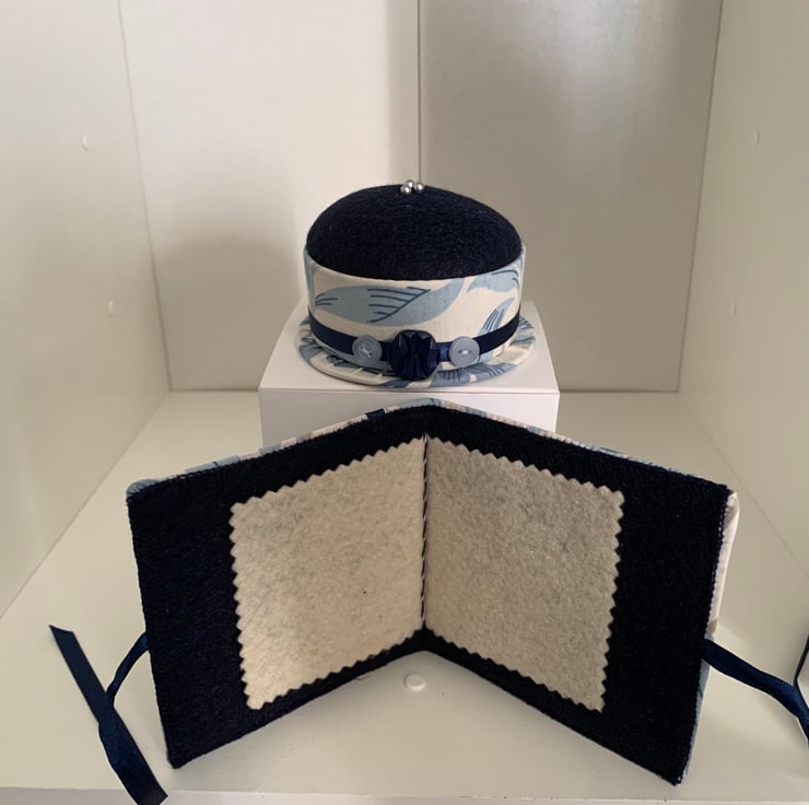 The pincushion has a firm recycled round cardboard base covered with blue and cream leaf patterned cotton. This has a navy blue satin ribbon trim decorated with one navy and two pale blue buttons. The pincushion part is made from navy blue felt stuffed with fibre fill and fixed firmly into the circular cardboard base. Three round headed pins are included.