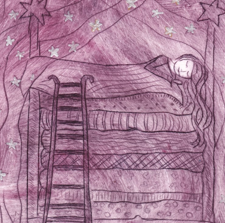 Drypoint etching of a Sleeping Princess. Based on the Fairy Story the Princess and the Pea. Printed in a darkish pinky purple. Also available in lighter tones in my shop. Look in my Drypoint etching Collection.