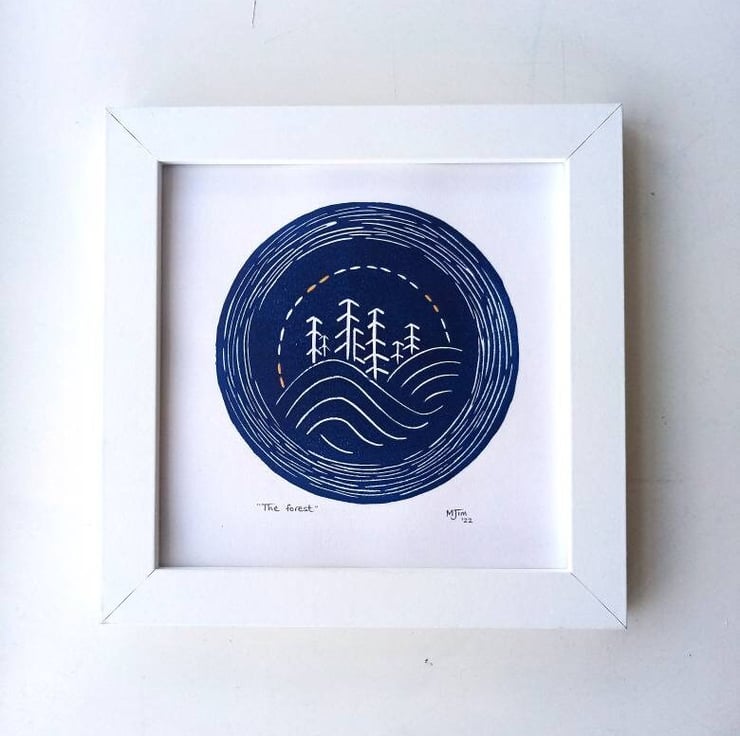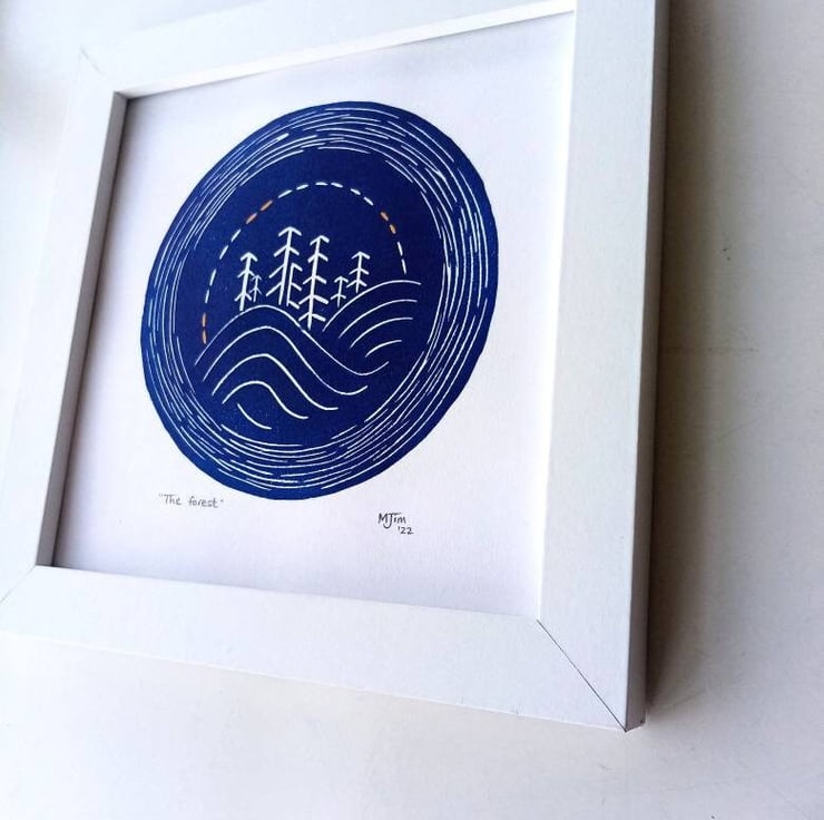 Handprinted ECO Linoprint Forest Tree Camping Linocut Outdoors Night Print Decor