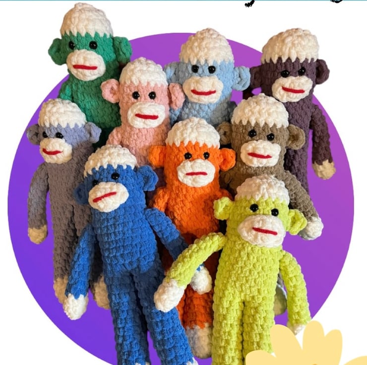 These are just adorable crochet Sock Monkey’s, handmade using a variety of brightly coloured chunky blanket yarns, adding a different twist on the original Sock Monkey.