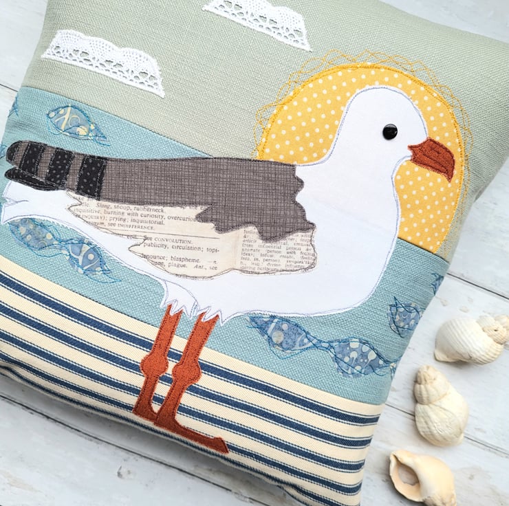 This handmade Seagull Cushion has been carefully sewn using freemotion machine embroidery & applique fabrics in beautiful sea themed hues. Finished with cotton lace for clouds.
