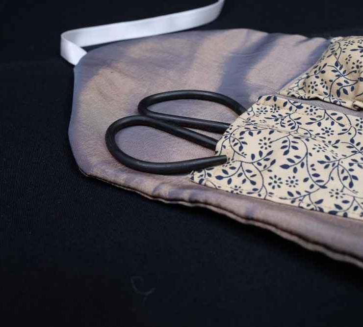 It has pockets for mini bobbins and scissors, and a pin cushion.