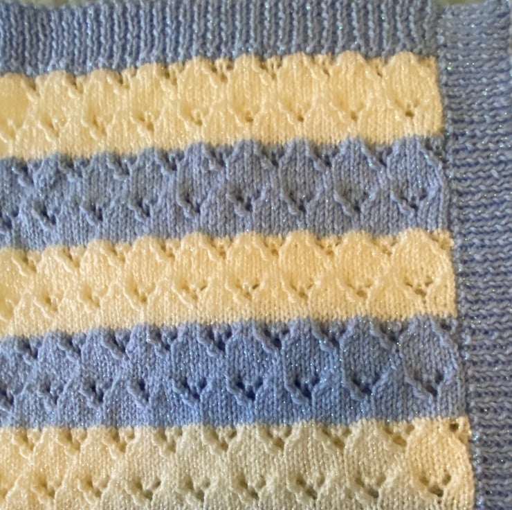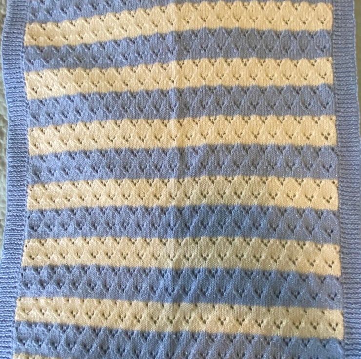 Hand knitted with love a beautiful pale blue and ivory blanket.