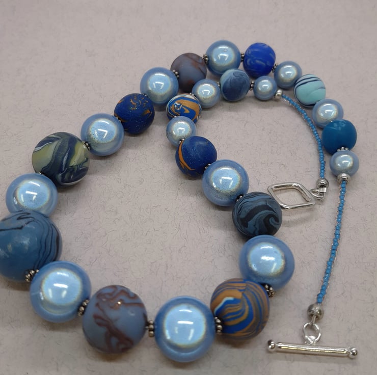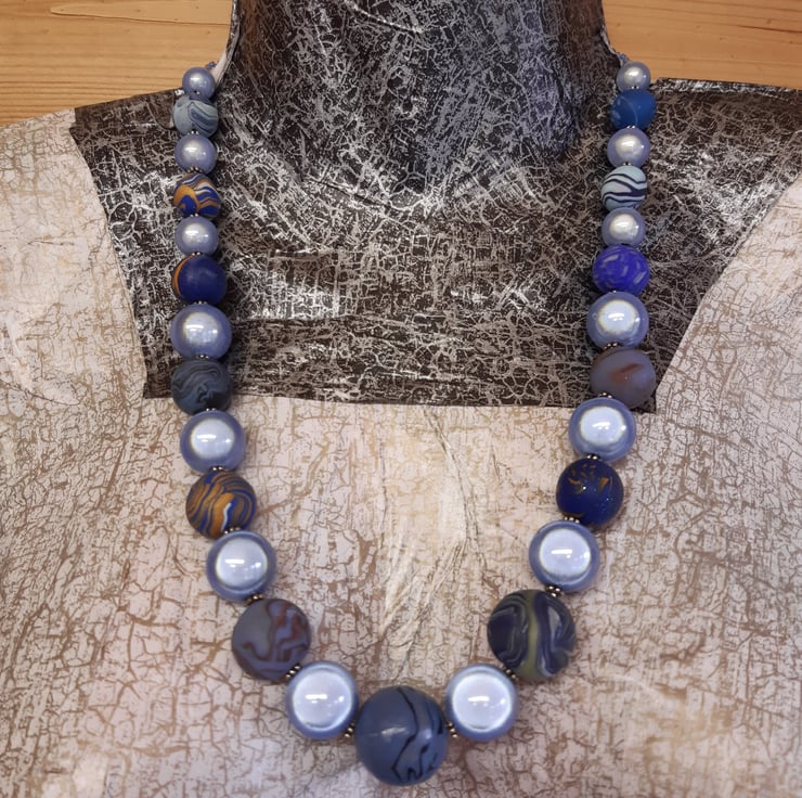 A striking necklace featuring a mixture of handmade polymer clay beads in various shades of blue with swirls of orange, black, gold, white and green.