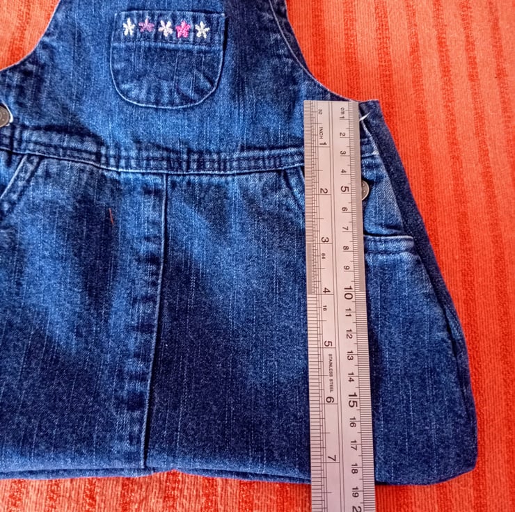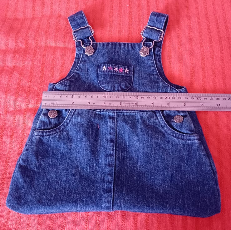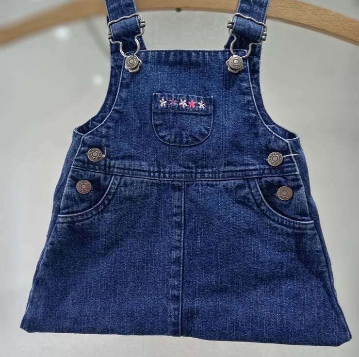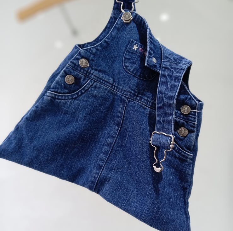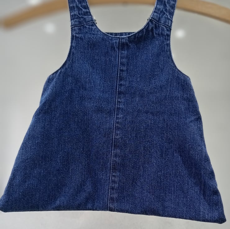 A girls denim pinafore upcycled into a lovely peg bag. It has the benefit of the fasteners being useable so they can be undone to actually hang the bag on your washing line or rotary drier.