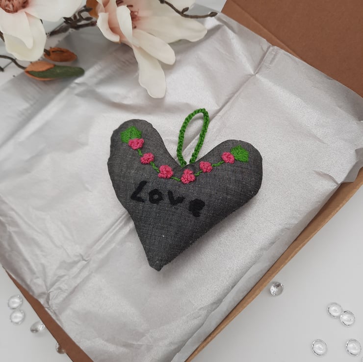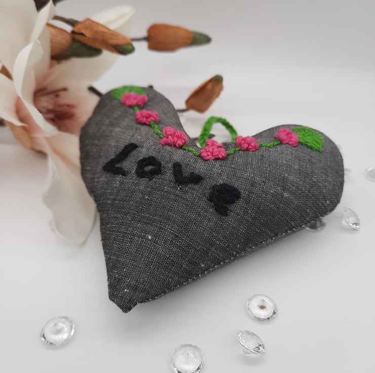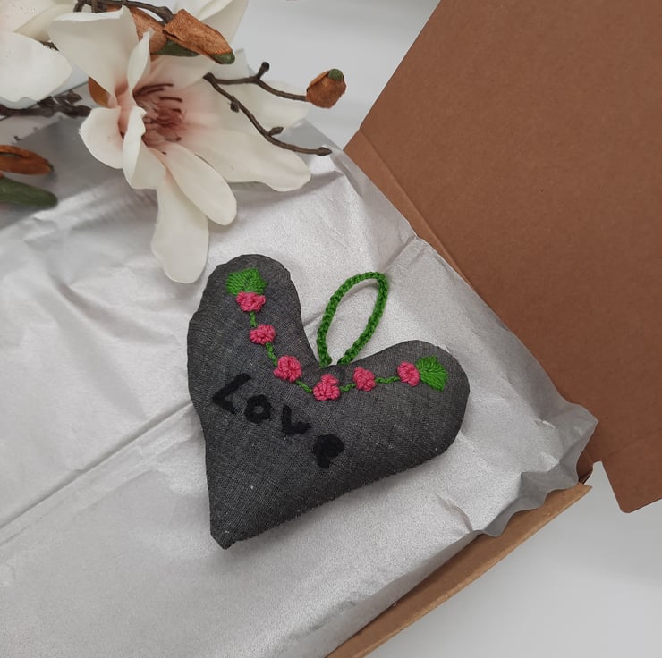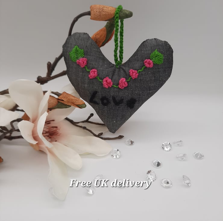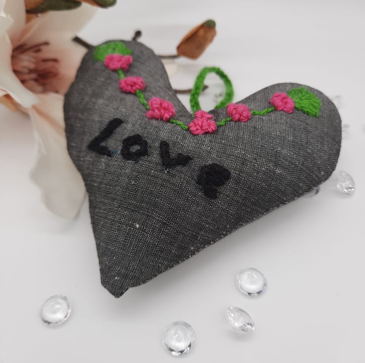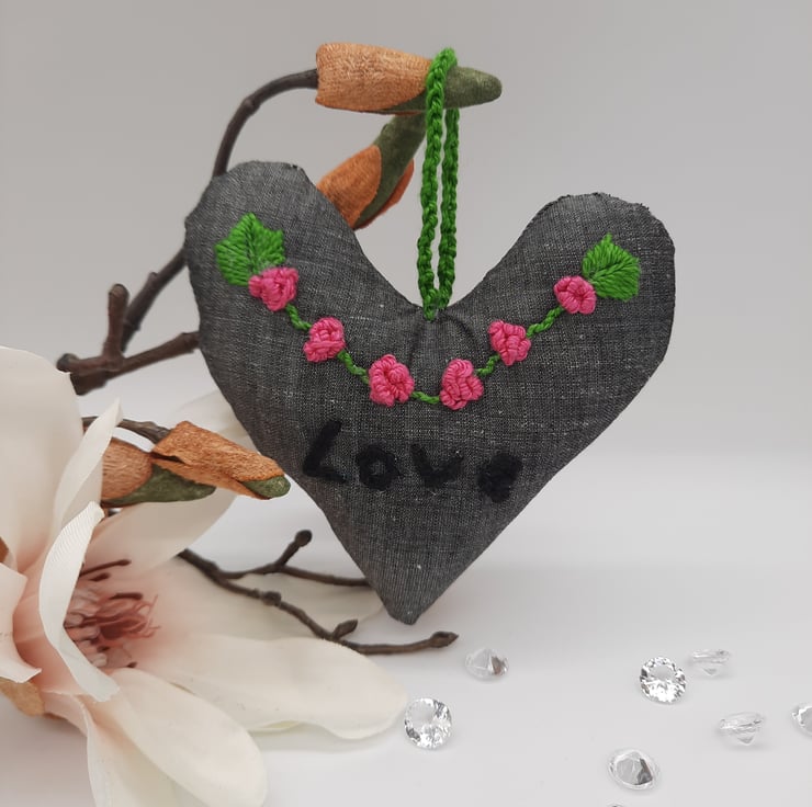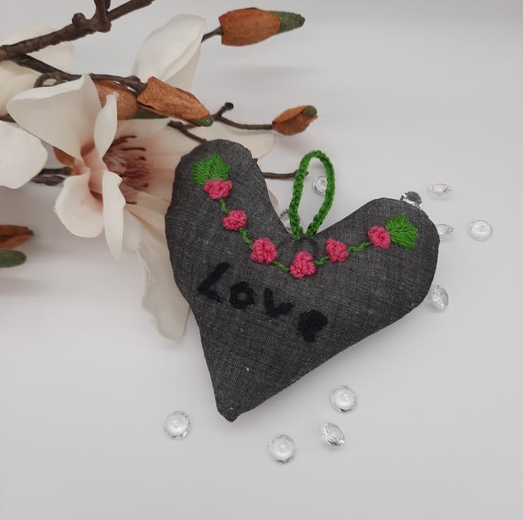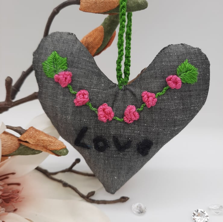 It has a row of 6 hot pink embroidered flowers with leaves at both ends. A matching green chain weaved hook and the word "Love" embroidered with chain stitch across the bottom.